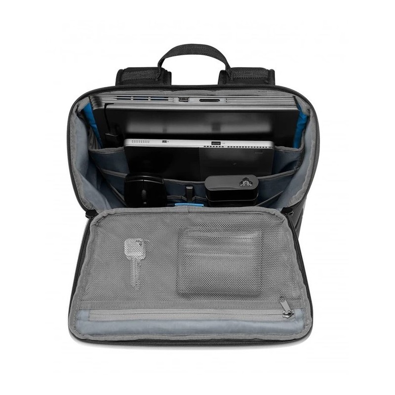 El interior está diseñado para una organización óptima, con un bolsillo profundo para libros y accesorios, junto con compartimentos dedicados para accesorios más pequeños, como auriculares. Los bolsillos laterales permiten llevar una botella de agua y un paraguas, y el panel trasero de malla asegura que la mochila sea cómoda y ventilada en días calurosos.