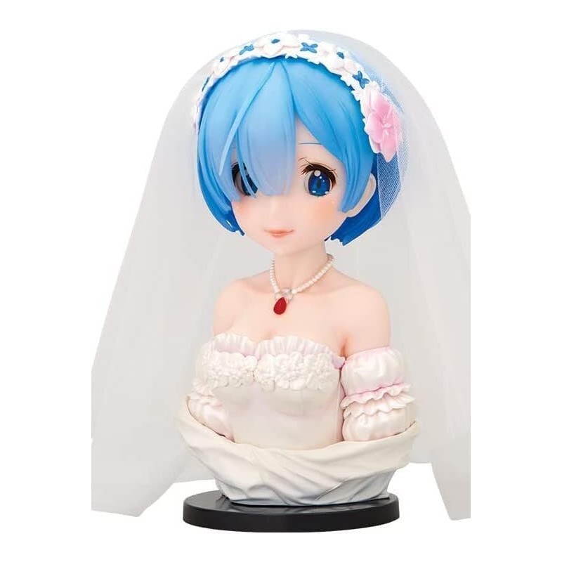 El diseño presenta a Rem con un cabello azul brillante adornado por una diadema de flores blancas y rosas, acompañada de un delicado velo que añade un toque de sofisticación. Su vestido de boda, ricamente decorado con detalles florales, resalta su expresión dulce y cautivadora. Esta figura no solo es un regalo ideal para los fans de la serie, sino también un complemento perfecto para cualquier colección de figuras de anime.