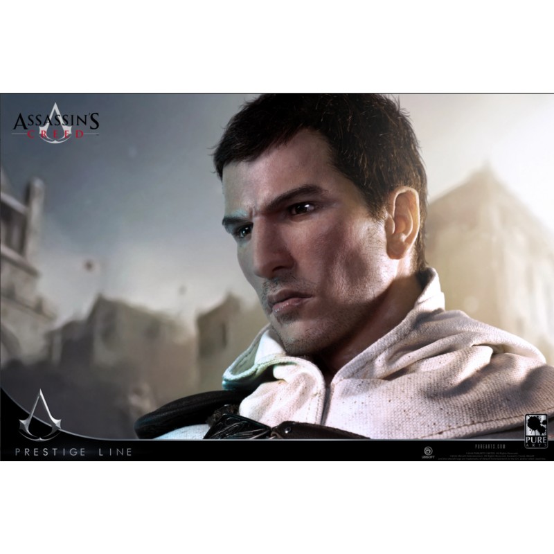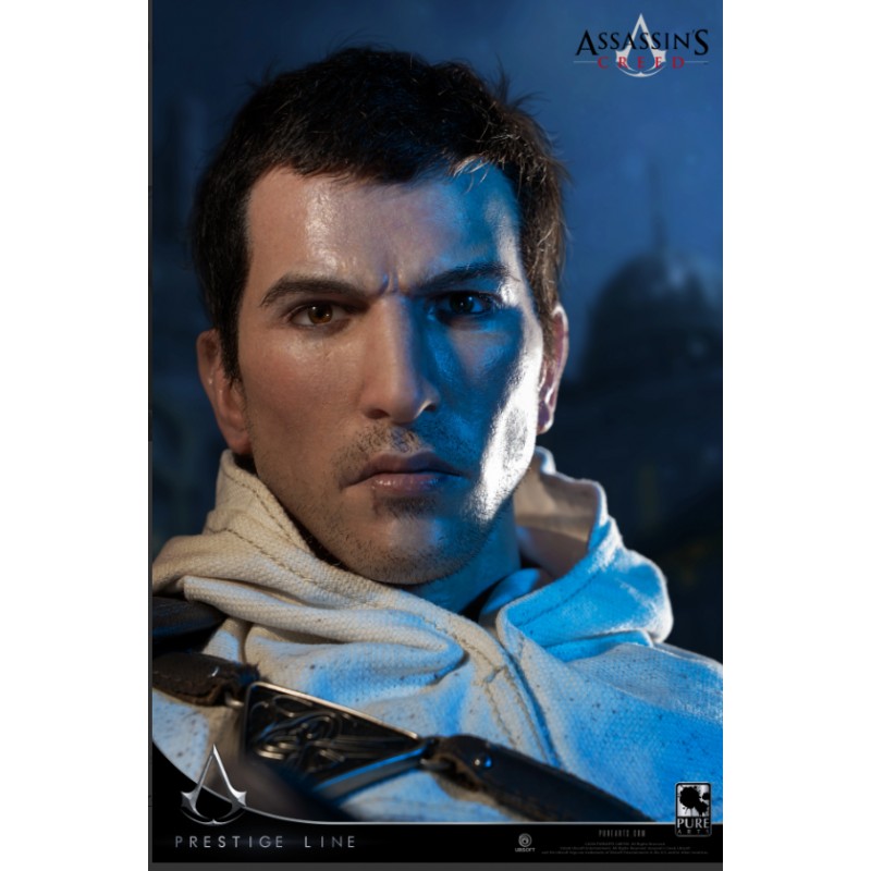 Esta estatua, con más de 100 cm de altura, captura la esencia de Altaïr Ibn-La'Ahad con una cabeza hiperrealista moldeada en silicona, mostrando ojos, cabello, cejas, pestañas y barba incipiente artesanalmente creados, insertados a mano uno a uno.