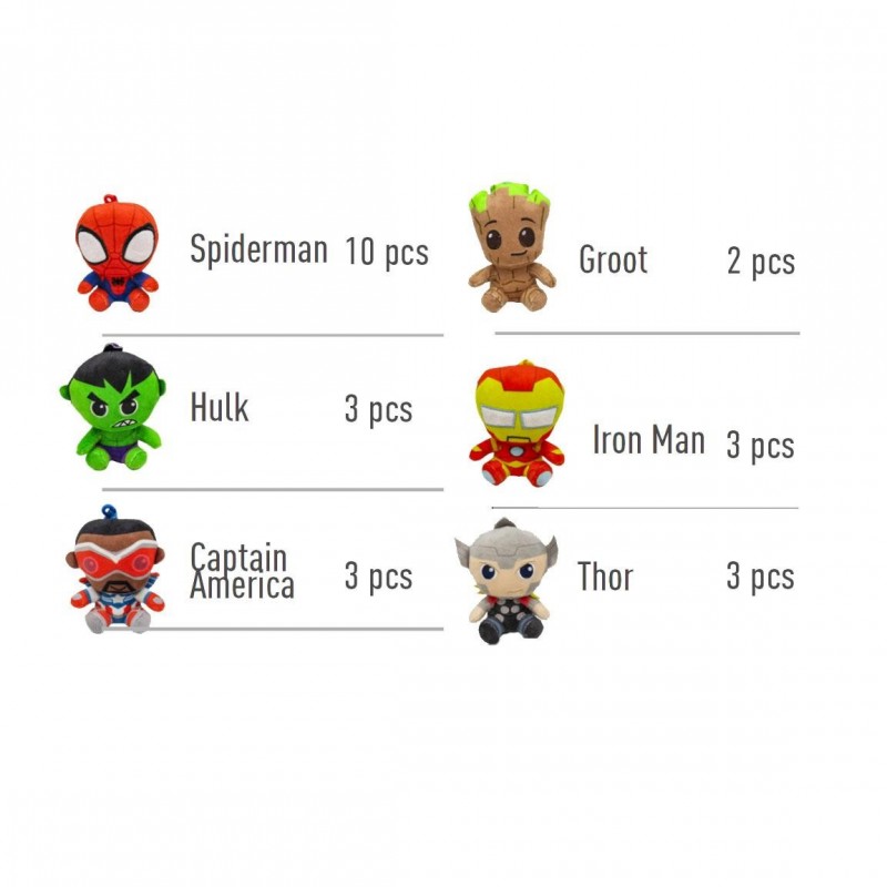 Descubre los Llaveros Marvel Bag Clips, una colección ideal para los fans del universo Marvel. Estos llaveros presentan a tus superhéroes favoritos en adorables versiones en miniatura, incluyendo a Spiderman, Groot, Hulk, Iron Man, Capitán América y Thor. Cada figura mide aproximadamente 13 cm y está diseñada en un estilo de peluche suave y colorido.