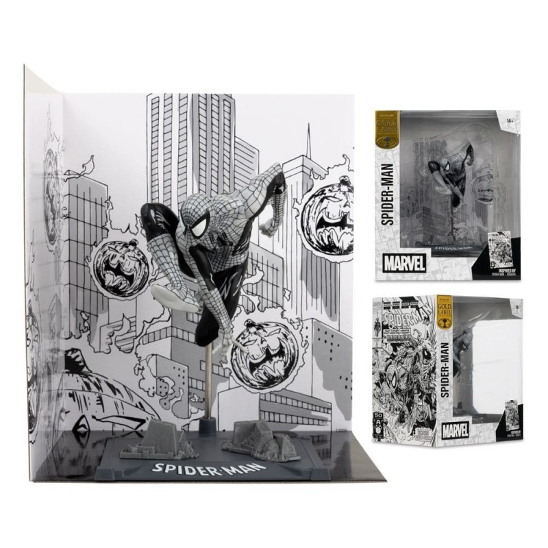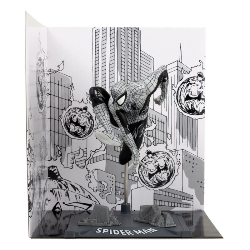 Sumérgete en el mundo del universo Marvel con esta exquisita estatua de Spider-Man de McFarlane Toys. Este producto detallado, fabricado en PVC, mide aproximadamente 10 cm de alto y presenta a Spider-Man en un dinámico diseño line art, capturando la esencia del cómic de una manera única y estilizada. La estatua está cuidadosamente pintada en blanco y negro, delineando con precisión cada detalle del traje clásico del Hombre Araña. Viene equipada con una base de diorama que simula una escena urbana, añadiendo un toque extra de autenticidad a cualquier colección.