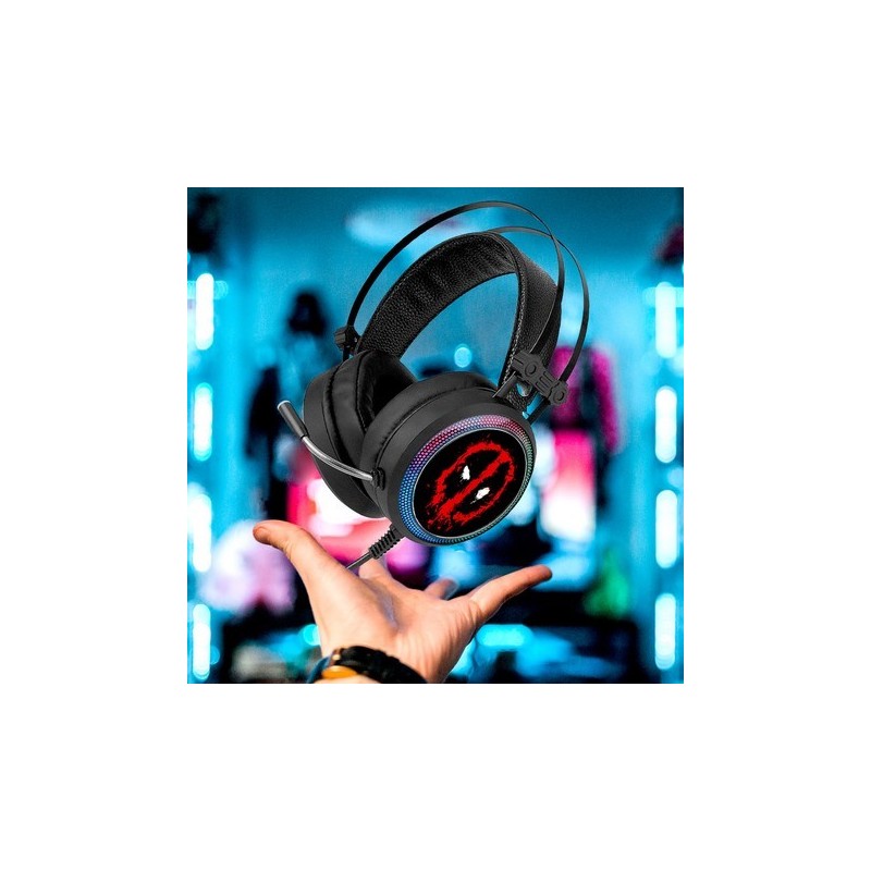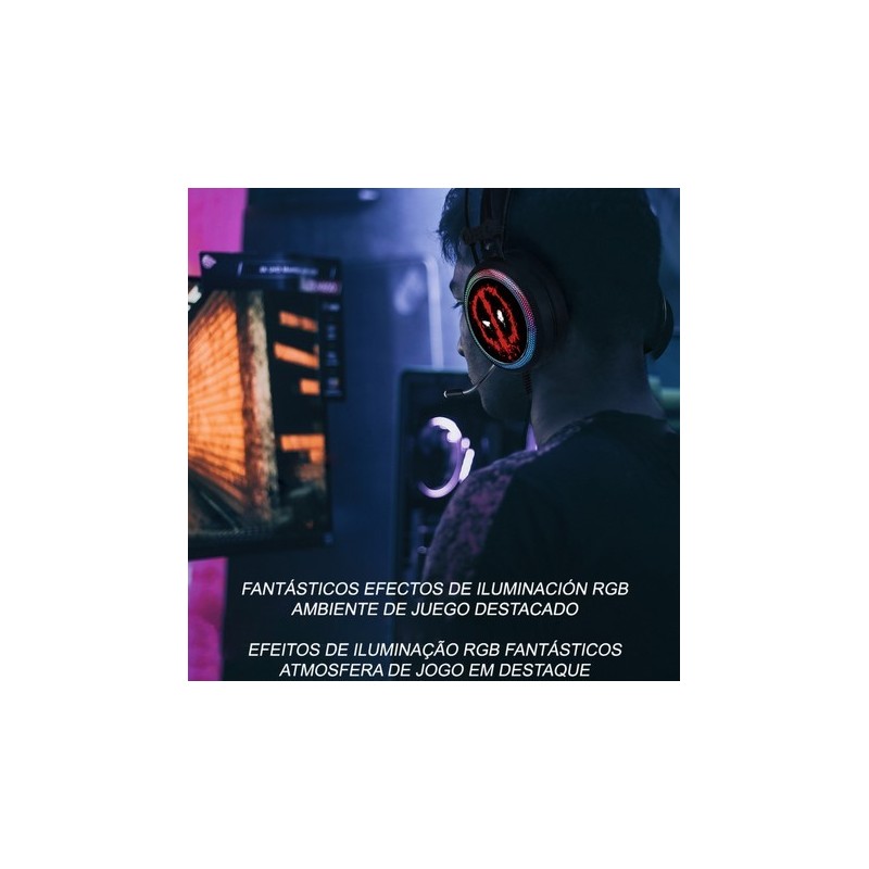 Descubre la experiencia de juego definitiva con los auriculares gaming Deadpool Marvel, una combinación perfecta de estilo y funcionalidad. Estos auriculares, con licencia oficial de Marvel, llevan el icónico logotipo de Deadpool en sus laterales, iluminados con luces LED RGB que aportan un toque vibrante a tus sesiones de juego.