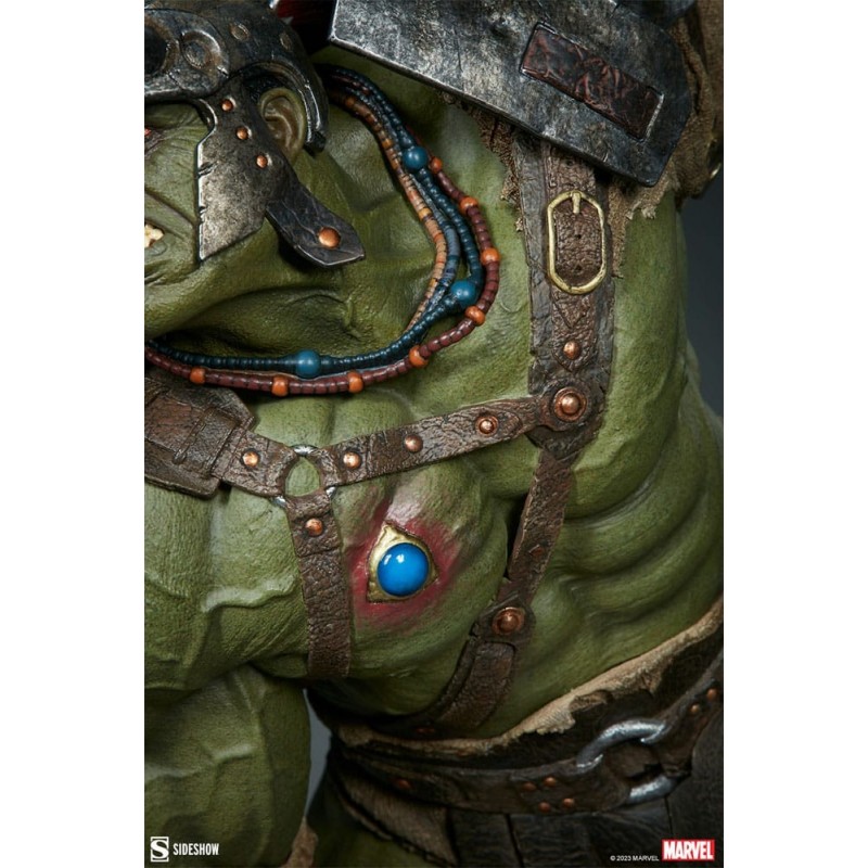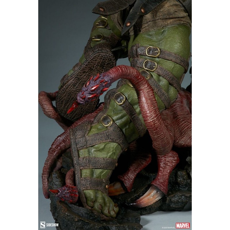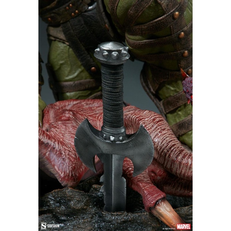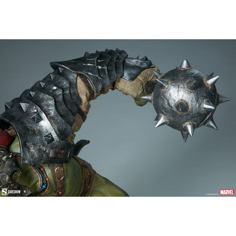 Representando a Hulk en su versión más feroz, esta estatua lo muestra aplastando a una criatura alienígena con su brazo levantado, sosteniendo una enorme maza. Desde los músculos definidos hasta la armadura desgastada por la batalla, cada elemento está diseñado para resaltar la brutalidad y el poder del personaje.