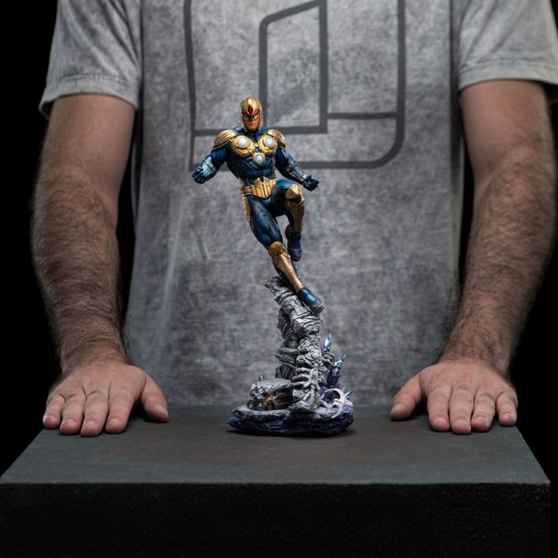 Descubre la impresionante estatua de Nova a escala 1/10 de Marvel, fabricada por Iron Studios. Esta figura de 32 cm captura a Nova en una pose dinámica, con detalles minuciosamente esculpidos que destacan su icónico traje azul y dorado.