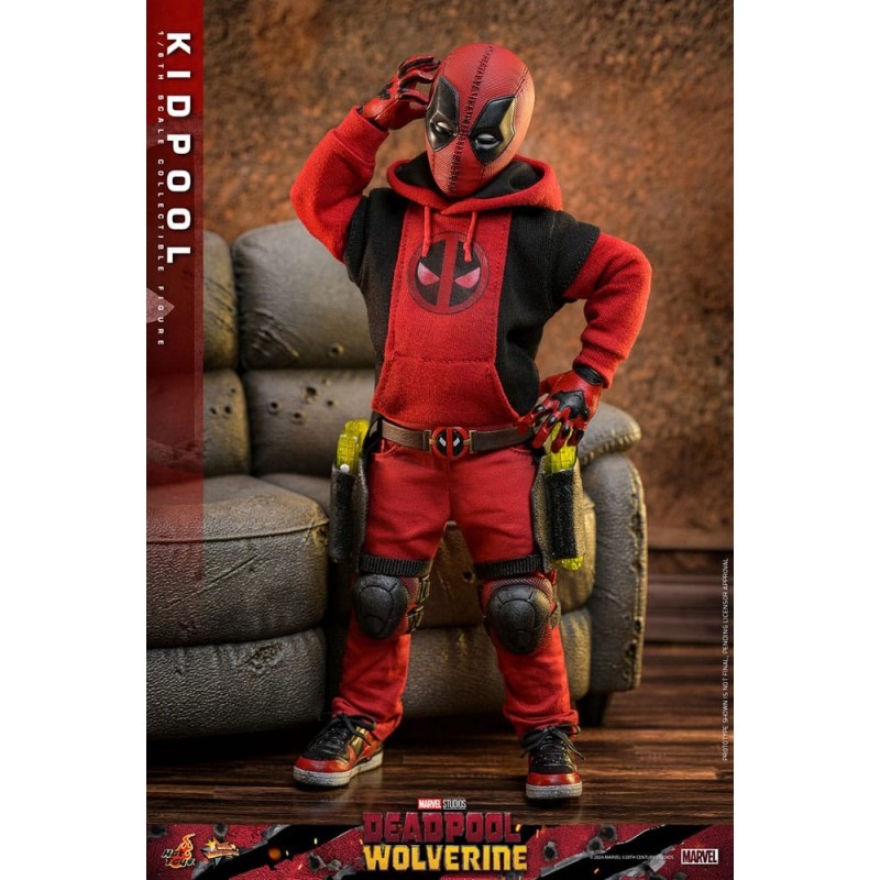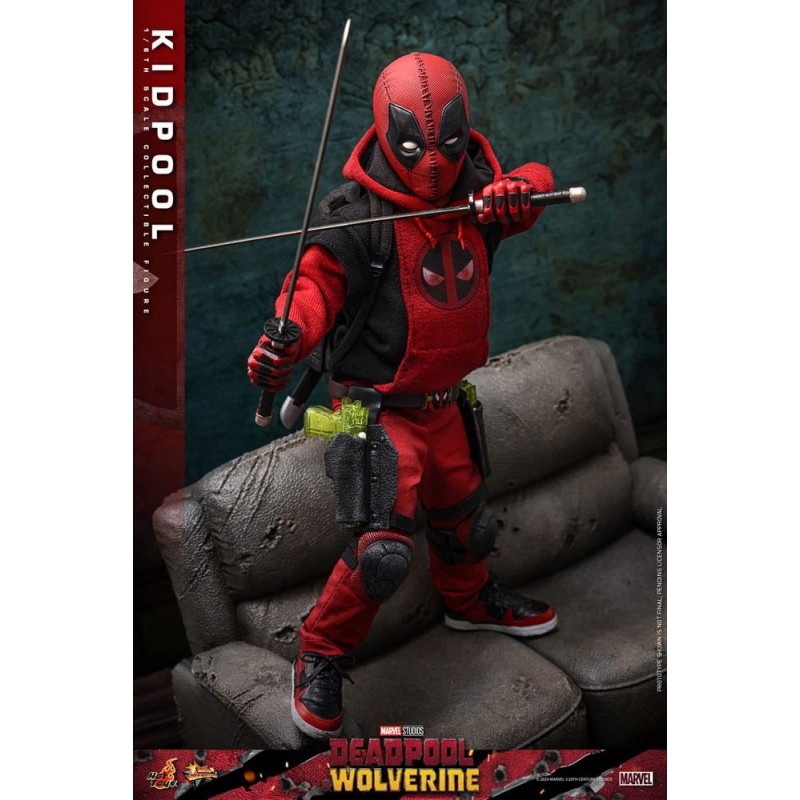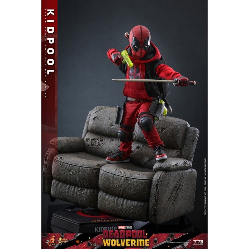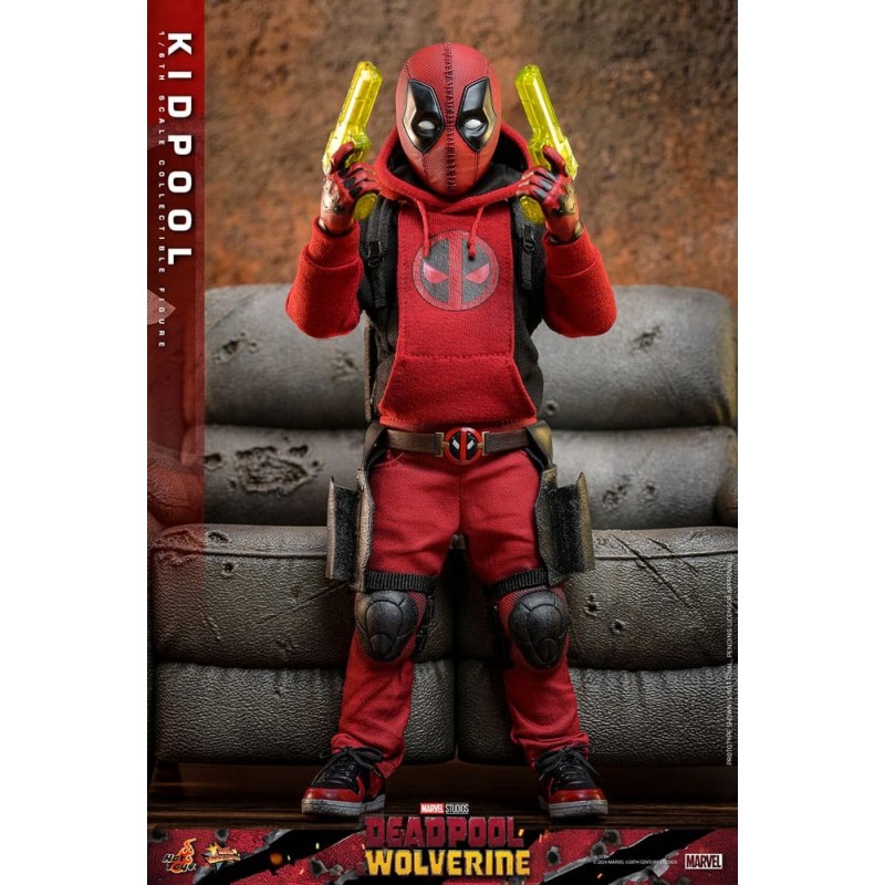 Descubre la increíble figura articulada de Kidpool, inspirada en la película 'Deadpool & Wolverine'. Con una altura aproximada de 22 cm y fabricada a escala 1/6, esta pieza es un sueño para cualquier fan de Marvel. La figura está vestida con un atuendo rojo y negro, típico de Deadpool, e incluye detalles como capucha, pistolas de agua translúcidas y mochilas con funda para espadas. Además, cuenta con expresiones faciales intercambiables para capturar cada esencia del personaje.