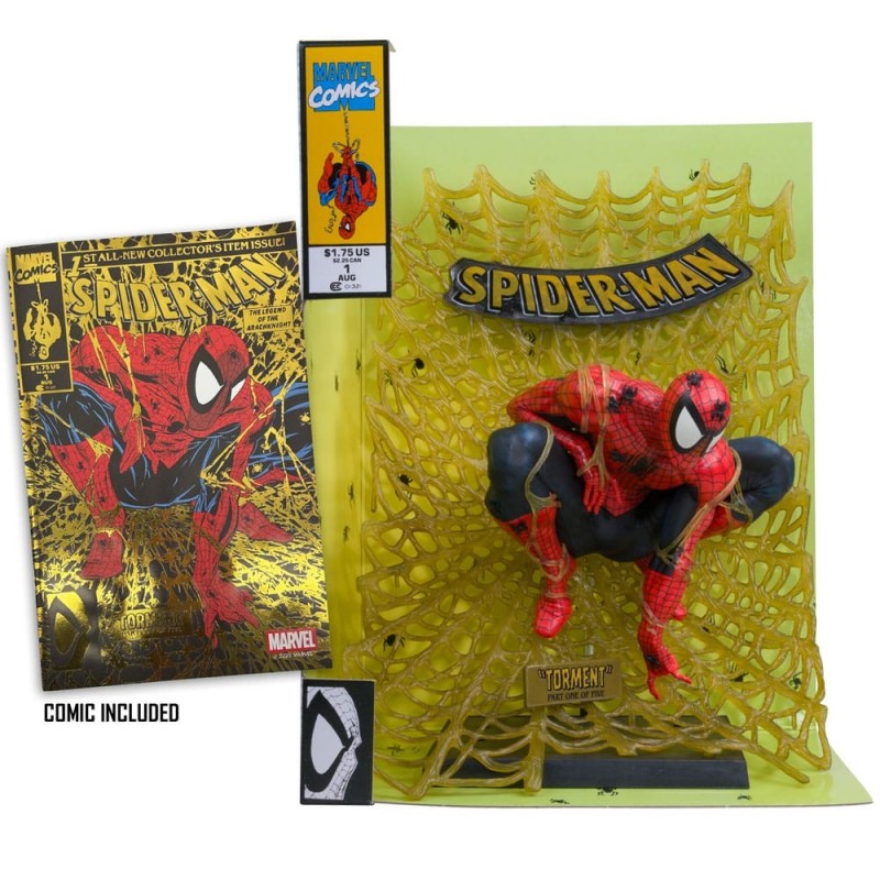 La estatua de Spider-Man Gold Edition de Marvel cautiva a cualquier fan de los superhéroes. Esta impresionante figura de PVC de 15 cm presenta a Spider-Man en una pose dinámica sobre una detallada base de diorama que simula una telaraña dorada. La calidad del diseño refleja perfectamente la esencia del personaje, vestido con su icónico traje rojo y azul.