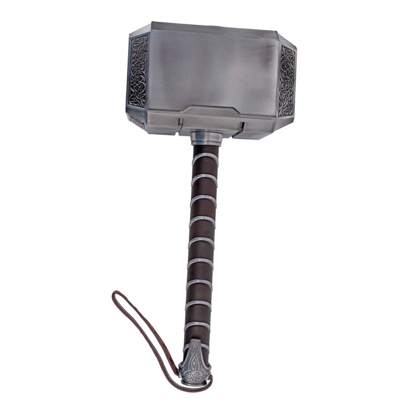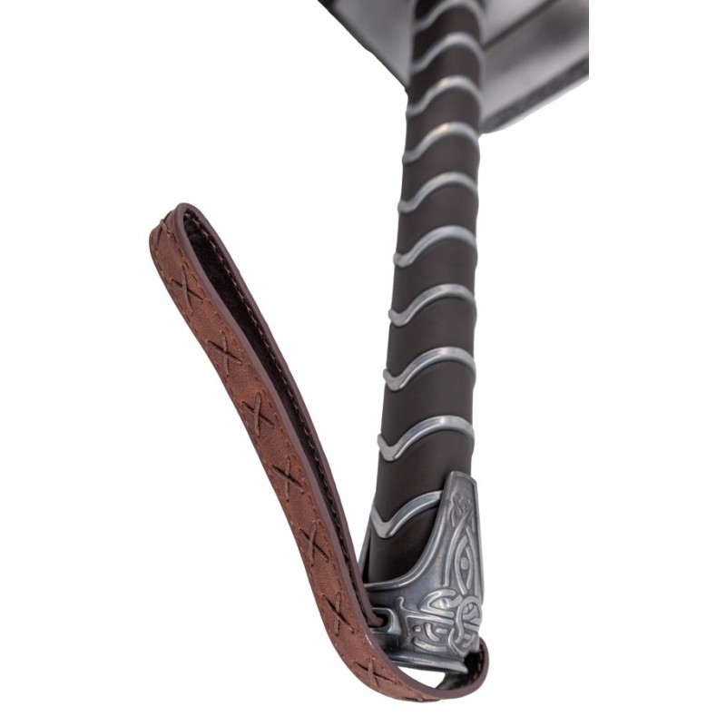 Esta impresionante réplica del Martillo de Thor Mjolnir hecha en acero es un imprescindible para cualquier fan de Marvel. Con un tamaño de 49 cm de largo, 23 cm de ancho y 14 cm de profundidad, este martillo destaca por su diseño detallado que incluye motivos nórdicos labrados en los laterales. El mango marrón y plateado añade un toque de autenticidad, complementado con una correa de cuero cruzado para facilitar su manejo. Además, viene acompañado de un soporte en forma de roca que mide 28 cm de largo, 24 cm de ancho y 8.5 cm de alto, proporcionando una forma elegante de exhibir tu martillo. Pesando un total de 5 kg, es lo suficientemente sólido para hacer honor al arma del Dios del Trueno.