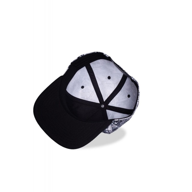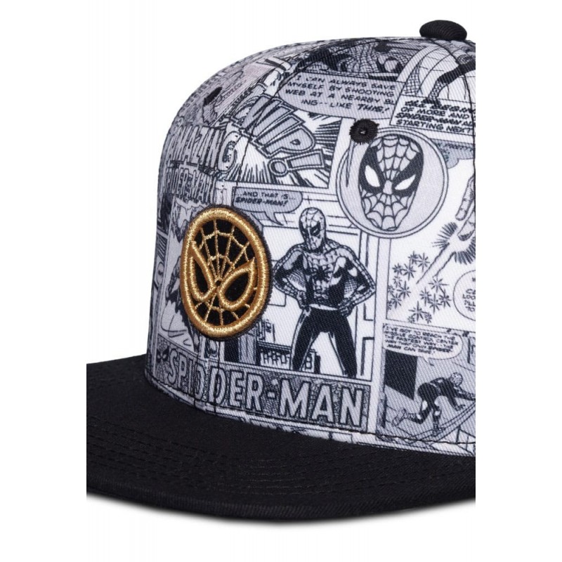 Con un diseño audaz, esta gorra presenta un estampado estilo cómic en blanco y negro que representa escenas icónicas de Amazing Spider-Man. El logotipo bordado en el frente añade un toque de distinción, destacando con un color dorado que resalta sobre el fondo gráfico. La visera plana de color negro completa el look moderno y urbano.