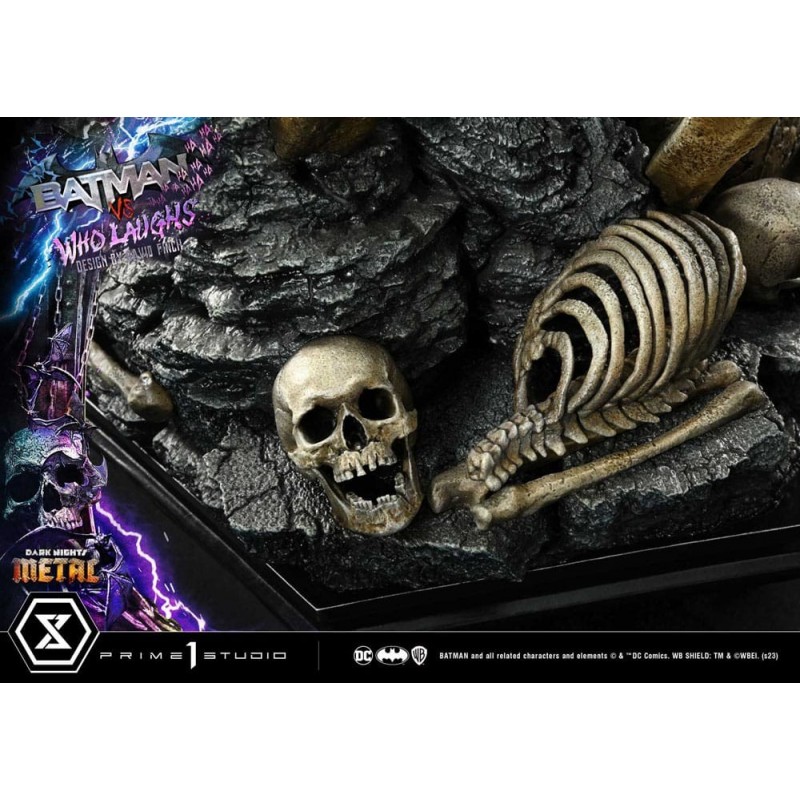 Esta estatua no solo impresiona por su tamaño y nivel de detalle, sino también por su iluminación LED incorporada, que realza la atmósfera sombría y dramática del enfrentamiento. Además, su base adornada con calaveras y esqueletos subraya la oscuridad del universo Dark Nights: Metal.