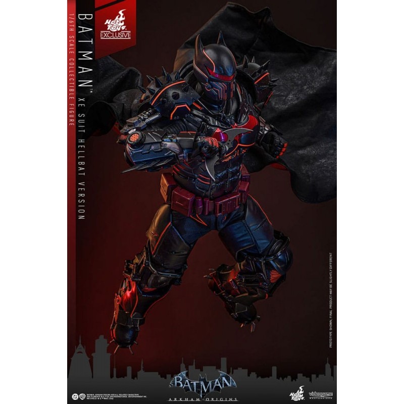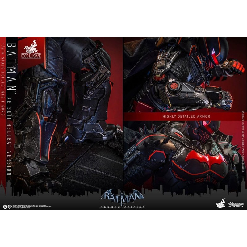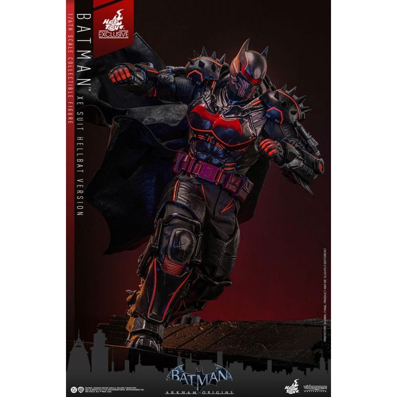 La figura articulada de Batman Arkham Origins XE Suit Hellbat es una exquisita pieza de colección, cuidadosamente diseñada por Hot Toys. Mide aproximadamente 33 cm y pertenece a la línea de figuras «Videogame Masterpiece» a escala 1/6. El diseño captura la esencia del traje Hellbat, con su imponente armadura negra acentuada por detalles en rojo, que le confieren un efecto visual impactante. La figura incluye una capa con alambres para darle forma, creando poses dinámicas.