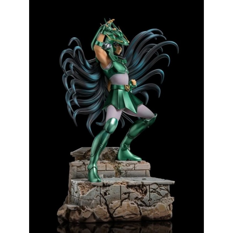 Esta impresionante estatua de Dragon Shiryu de Saint Seiya captura la esencia del personaje en una escala de 1/10. Con una altura de 24 cm, está fabricada en poliresina de alta calidad. La figura muestra a Shiryu con su emblemático atuendo verde y su casco distintivo, posando sobre una base que representa ruinas detalladas. Su capa ondeante y su postura heroica reflejan la majestuosidad del Caballero del Dragón.