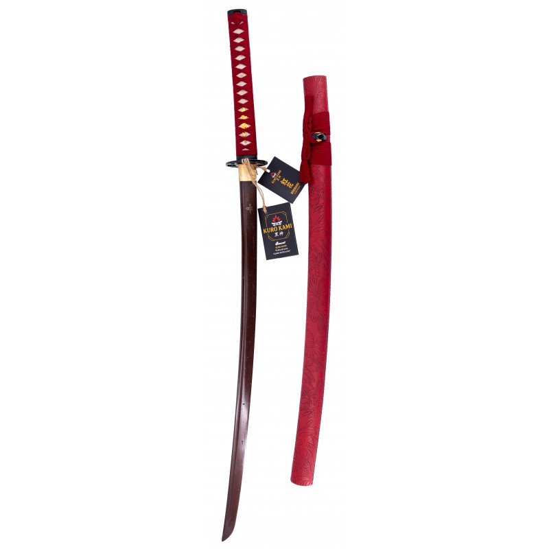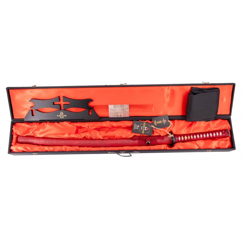 El diseño de la katana es impresionante, con una vaina de madera forrada en polipiel roja adornada con detalles de flores de loto. El mango está encordado en rojo y recubierto con piel de raya auténtica, ofreciendo un agarre seguro y elegante. Con un peso de 1,305 kg, incluye un soporte para exhibición, haciendo de esta katana una pieza ideal tanto para coleccionistas como para practicantes de artes marciales.