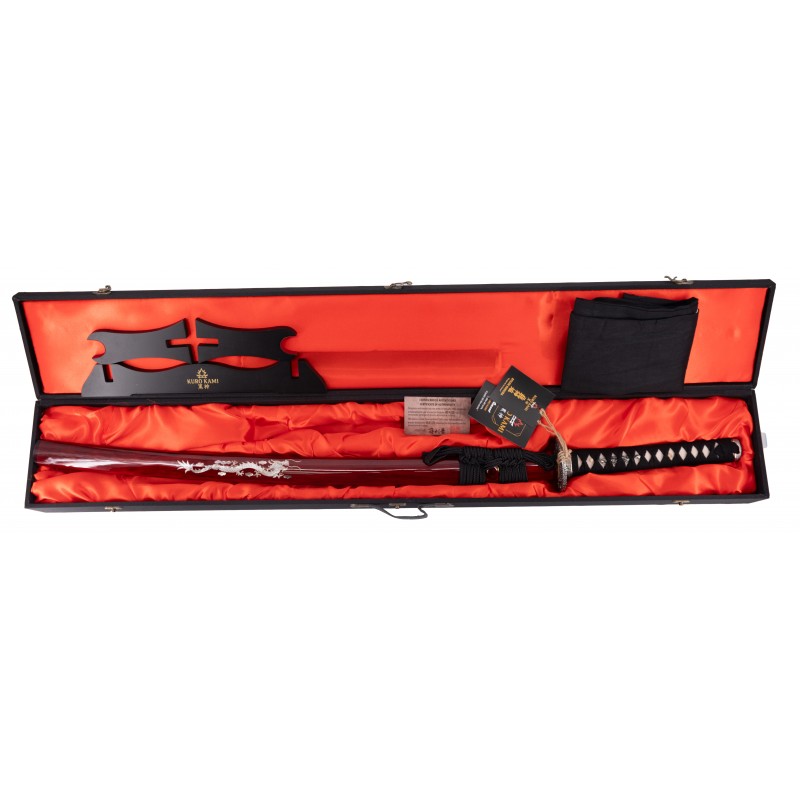 La vaina de madera presenta un acabado lacado en rojo profundo con intrincadas incrustaciones de concha marina en forma de dragón, mientras que el mango, encordado en rojo y recubierto de auténtica piel de raya, ofrece un agarre seguro y elegante. Con un grosor de hoja de 7,1 mm y un peso de 1398 gramos, este modelo S6066R es tanto una pieza de colección como un regalo original.