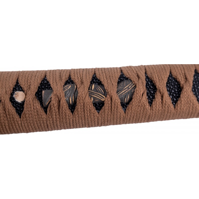 El mango de esta pieza está envuelto en un trenzado marrón con auténtica piel de serpiente, proporcionando un agarre firme y cómodo. Las piezas metálicas, incluyendo la tsuba, están adornadas con detalles de bambú, resaltando la temática y el simbolismo de la katana.