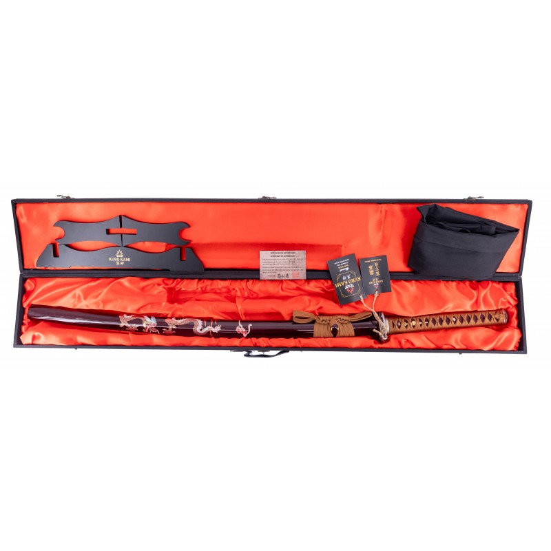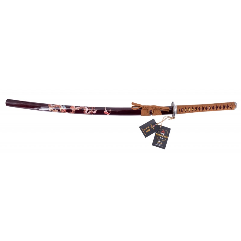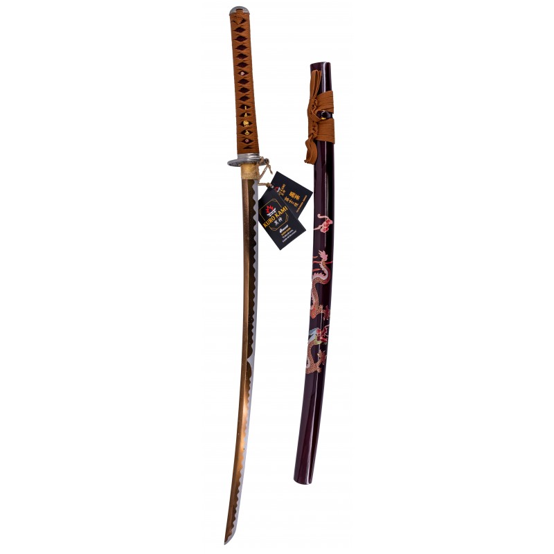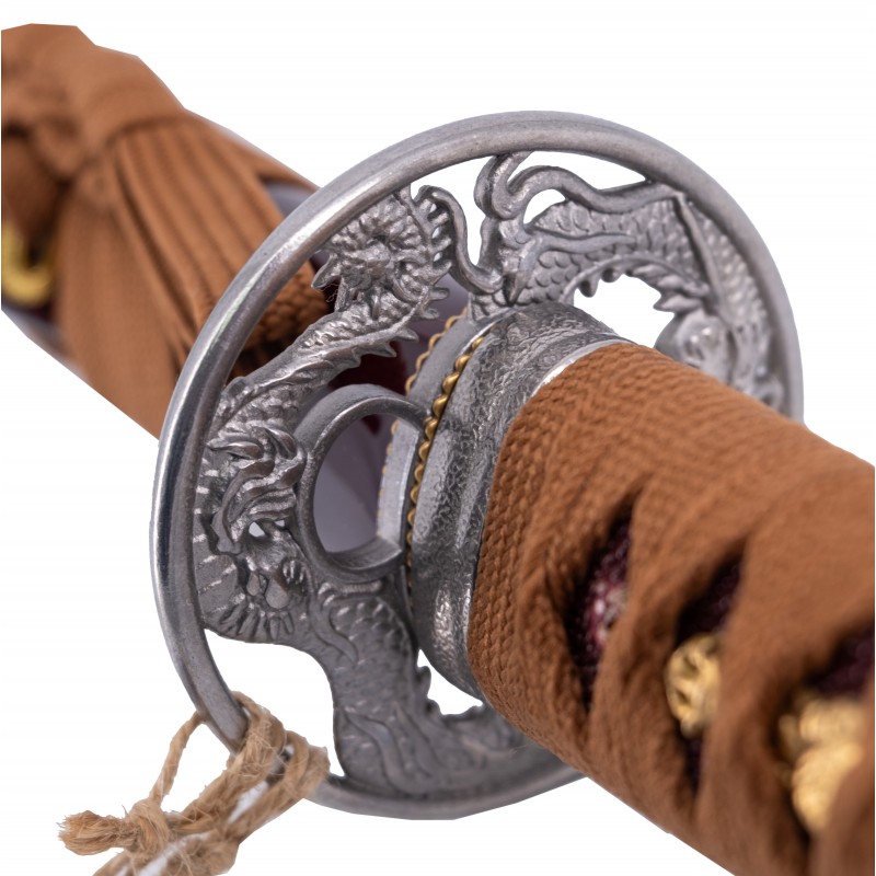 La vaina está hecha de madera lacada en un elegante marrón oscuro, decorada con intrincados detalles que resplandecen. El mango está envuelto en un trenzado marrón complementado con auténtica piel de serpiente, asegurando un agarre firme y seguro. La tsuba y otras partes metálicas son de acero inoxidable, añadiendo durabilidad y resistencia.