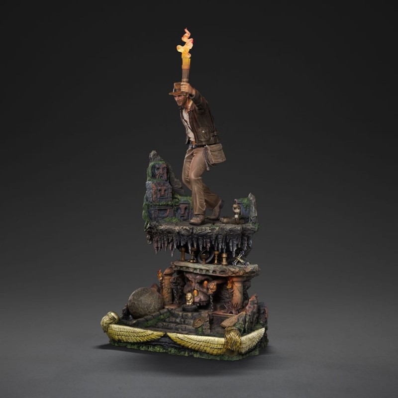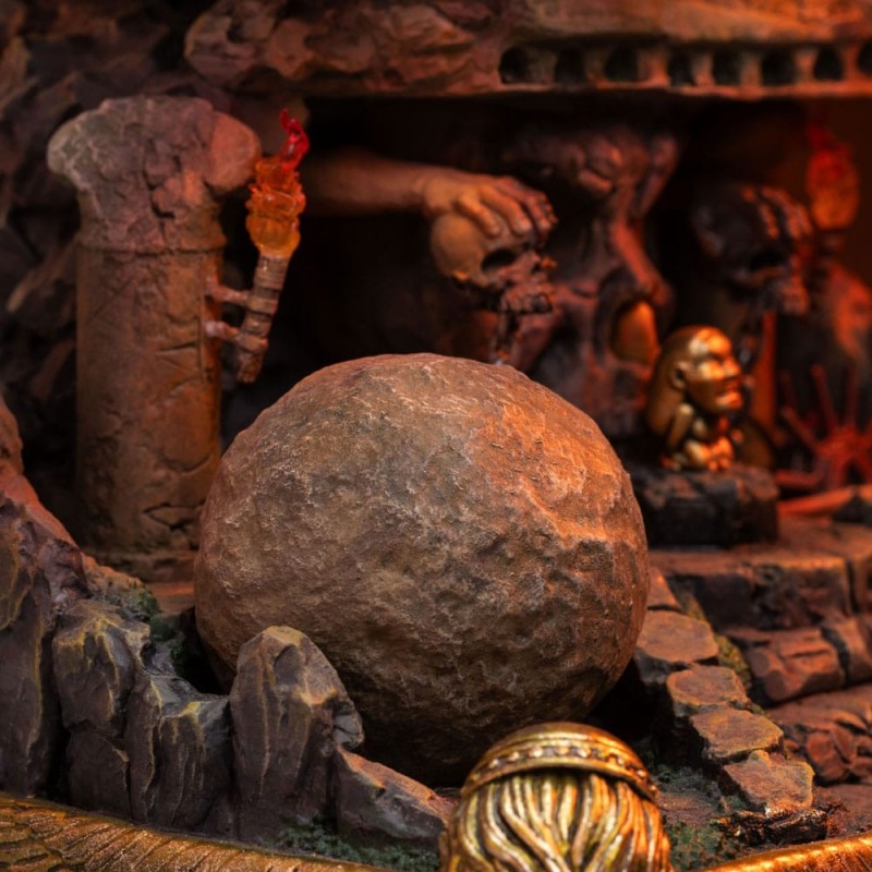 El entorno de la base está magistralmente trabajado, representando una escena llena de acción con una bola gigante, toques dorados y calaveras grabadas en la base. Perfectamente equilibrada y pintada a mano, cada pieza es única. Este producto con licencia oficial de Iron Studios es una joya para cualquier colección, ideal para regalar o para darte un capricho.