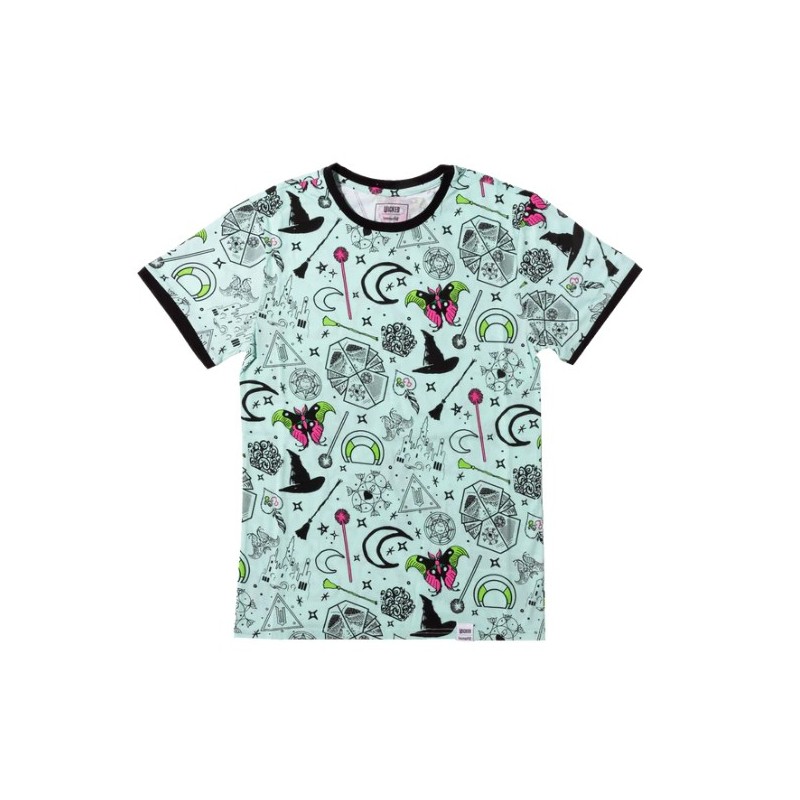 Descubre la camiseta Wicked Loungefly, una prenda mágica que destaca por su diseño único. Hecha de un material suave y resistente, esta camiseta presenta un vibrante color menta cubierto de icónicos símbolos mágicos en negro y detalles en rosa y verde. Su estampado incluye varitas, sombreros de bruja, y otros motivos que evocan un mundo de fantasía. Las costuras negras en cuello y mangas añaden un toque moderno y elegante. Ideal para los amantes del teatro musical Wicked o como un regalo original, esta camiseta de licencia oficial es la combinación perfecta de estilo y comodidad.