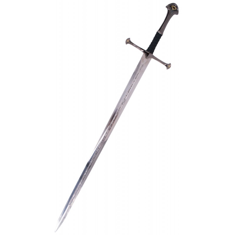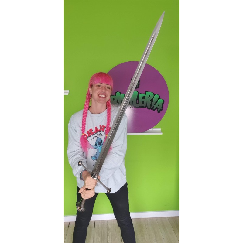 La hoja es larga y plateada, adornada con delicadas runas élficas que reflejan la historia épica de Narsil, la espada original. El pomo está magníficamente acabado con un diseño plateado, completando su aspecto majestuoso.