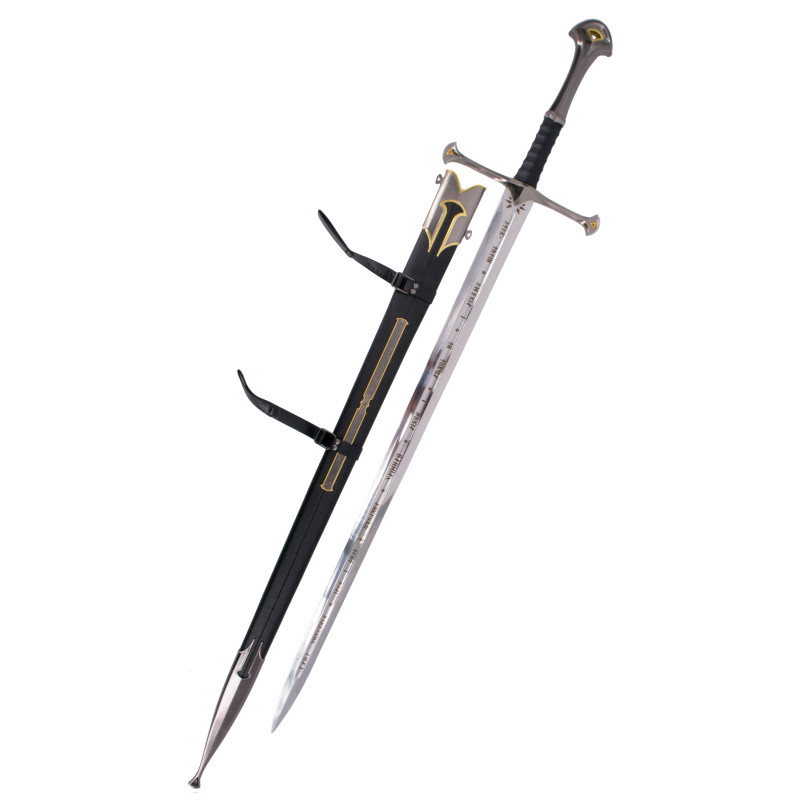 La espada sin duda más admirada de la saga El Señor de los Anillos es Anduril (La Llama del Oeste). No solo porque la maneja épicamente Aragorn en cada escena, sino también por toda su historia. Recuerda que fue forjada con los trozos de la espada Narsil de Elendil hace ya eones.