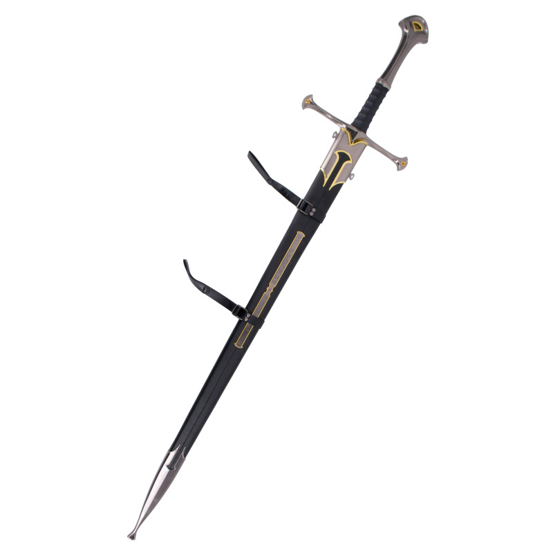 La réplica de esta espada mide unos 125 cm de longitud. Además el pomo de la empuñadura está acabado con un aspecto plateado y también incluye una vaina en polipiel con incrustaciones metálicas y un soporte de madera precioso con runas élficas para que la espada presida tu salón cuando no la empuñes. La hoja está fabricada en acero y tiene runas grabadas también.
