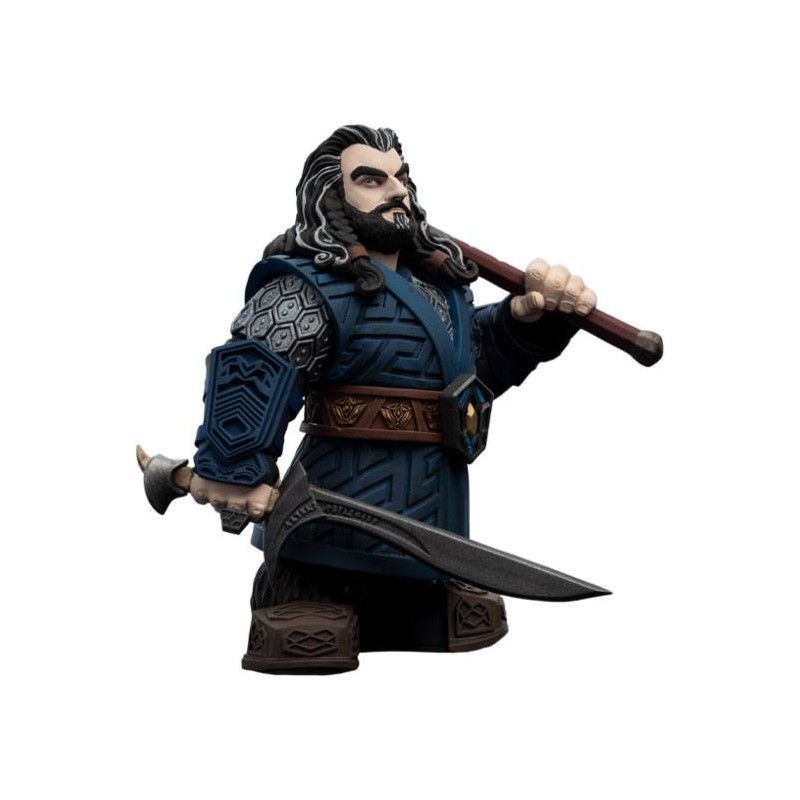 Esta figura cuidadosamente esculpida refleja a Thorin con su característico atuendo azul y detalles dorados en el cinturón. Observa su cabello y barba meticulosamente modelados, junto con el simbolismo en su armadura. En una mano empuña una espada adornada, mientras que en la otra porta un hacha, destacando dos de sus armas icónicas.