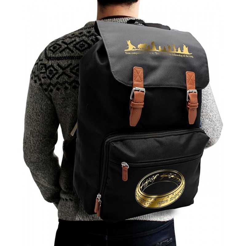 La mochila presenta un elegante color negro con detalles en dorado del Anillo Único, y una imagen de la Compañía del Anillo. Las correas ajustables en un atractivo tono marrón añaden un toque clásico y funcional. Es perfecta tanto para el uso diario como para coleccionistas de artículos de El Señor de los Anillos.