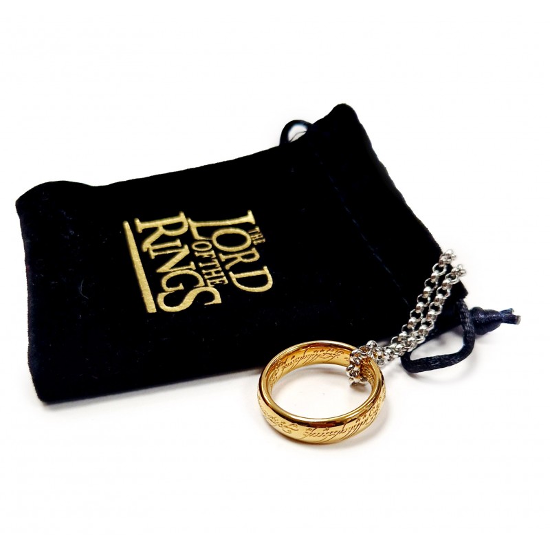 El anillo luce un acabado dorado que resalta las inscripciones élficas, y se presenta en una elegante bolsita protectora con el logo de la saga, ideal para los coleccionistas de memorabilia de El Señor de los Anillos.