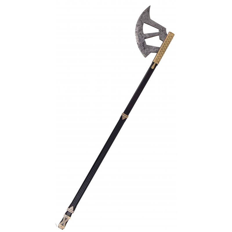 El mango de madera está recubierto con polipiel trenzada de color negro, complementado con embellecedores de metal que añaden un toque de elegancia y robustez. Incluye un soporte decorativo, ideal para exhibir este magnífico objeto de colección en tu hogar u oficina. Perfecto como un regalo original para fanáticos o simplemente para realzar tu colección con una pieza de gran calidad.