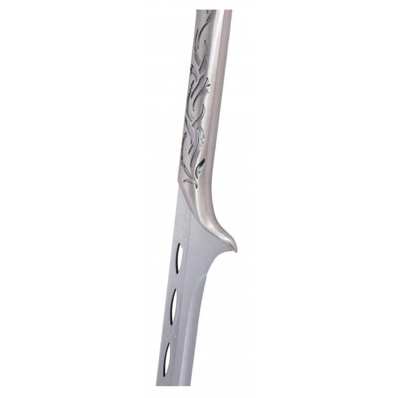 Esta impresionante réplica de la espada de Thranduïl del universo de El Señor de los Anillos es una joya para cualquier coleccionista. Con un tamaño total de 96 cm, esta espada se presenta con un mango metálico detallado que añade autenticidad y elegancia. La hoja, confeccionada en acero, mide 69 cm de longitud y cuenta con un grosor de 4,1 mm, proporcionando una estructura sólida y resistente.