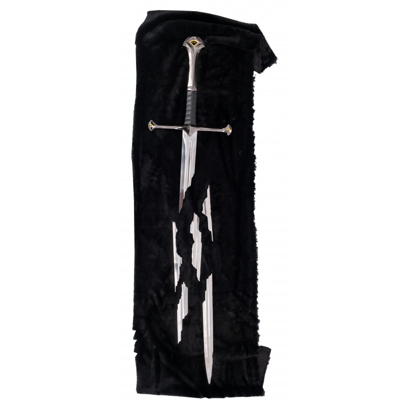 Esta réplica de gran calidad capta el momento icónico de la espada rota, presentando su hoja de acero cortada en pedazos y exhibida sobre una elegante tela negra. Con un grosor de hoja de 4,5 mm y un peso de 2 kg, esta pieza es perfecta para coleccionistas y fans de la trilogía. Su diseño detallado y significativo simboliza la renovación del linaje real.