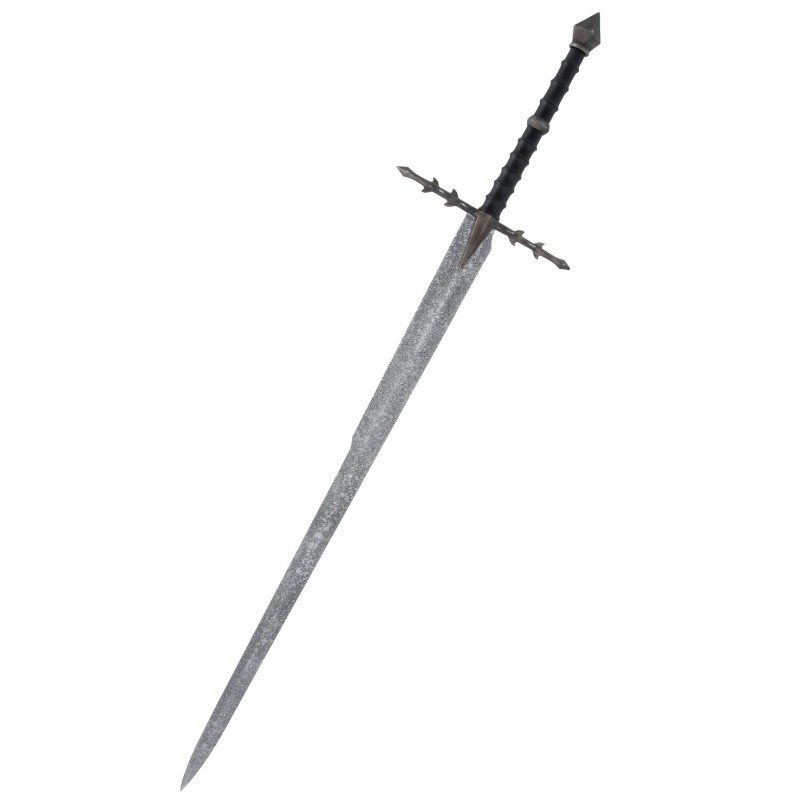 Con una longitud total de aproximadamente 135 cm, la espada cuenta con un filo de 101 cm y un espesor de 6.4 mm, perfectamente equilibrada con un mango envuelto en cuero auténtico, y una guarda y pomo de metal sólido. Incluye un expositor de madera con diseño serigrafiado y un certificado de autenticidad, garantizando su valor como pieza de colección.
