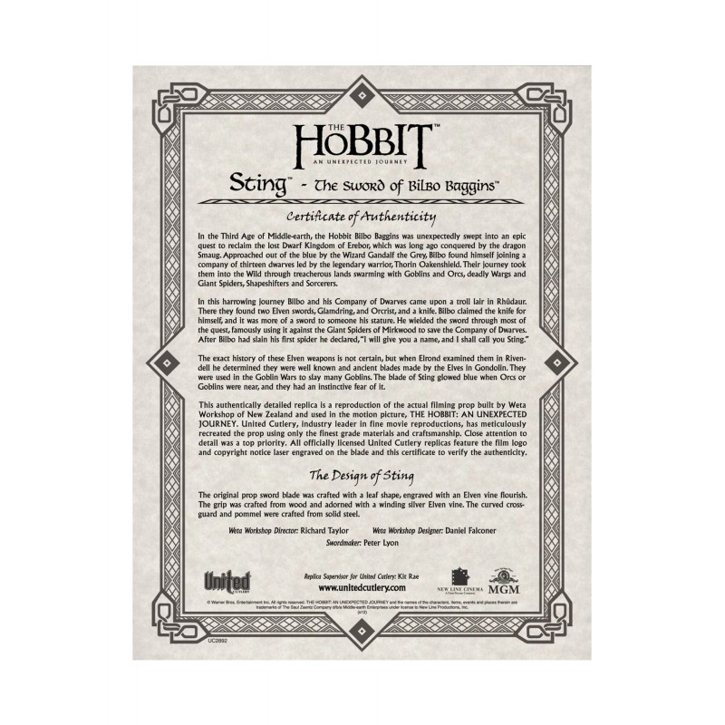 La Espada Sting de Bilbo Baggins es una réplica detallada de la película El Hobbit. Creada por United Cutlery, esta espada es una reproducción fiel del prop utilizado en el rodaje. La hoja de acero inoxidable AUS-6 mide aproximadamente 39 cm, con una longitud total de 56,5 cm.