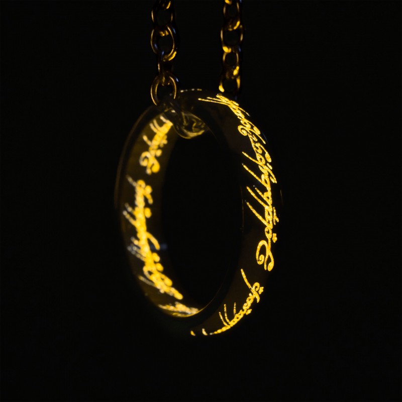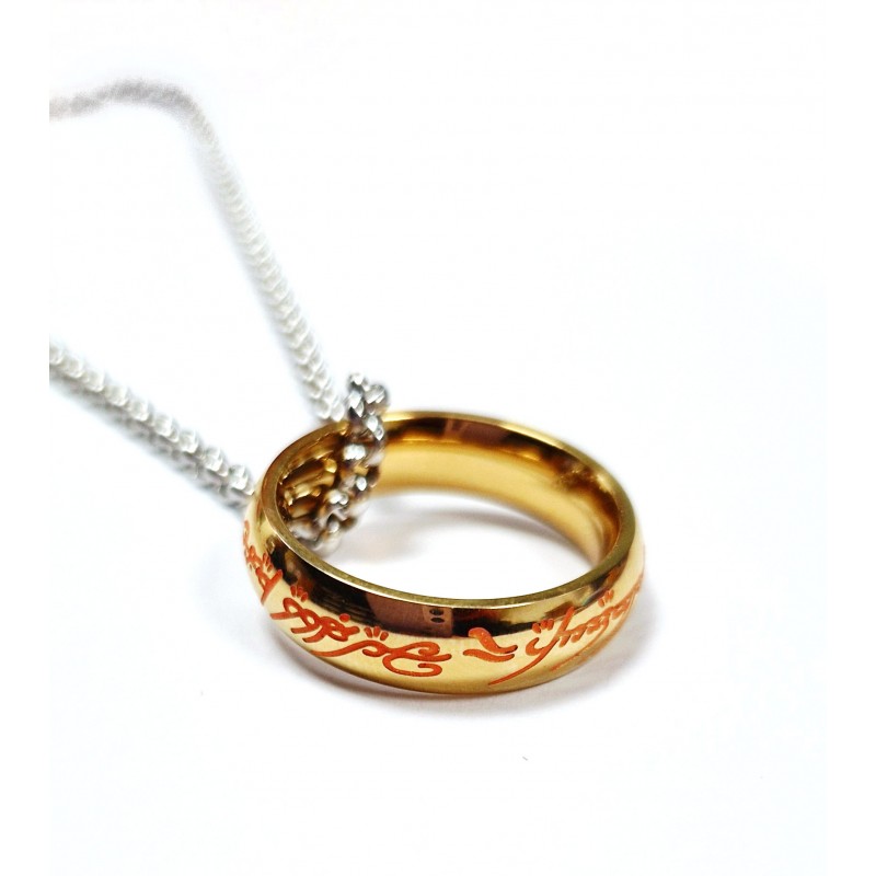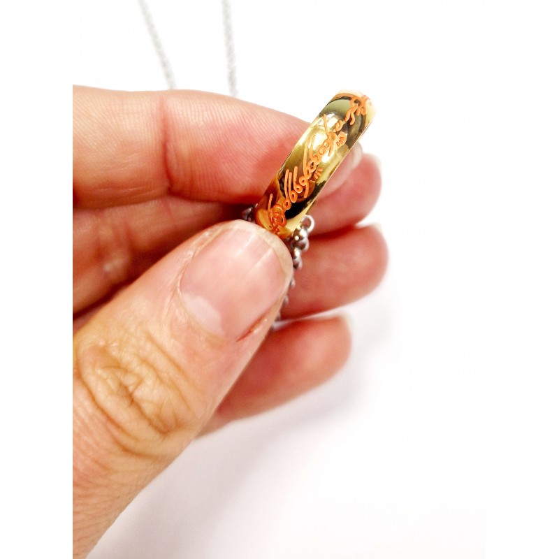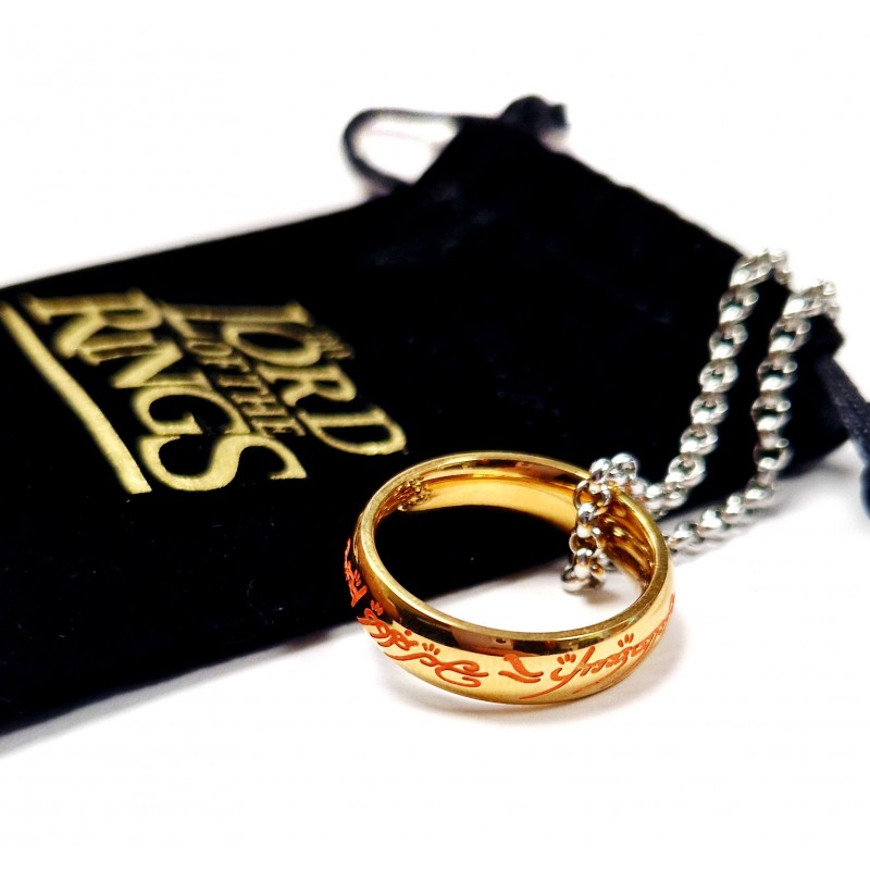 Descubre la magia del universo de El Señor de los Anillos con este anillo de acero único, diseñado por la prestigiosa marca Epic Collection. Este anillo, junto con una cadena, está fabricado en acero inoxidable de alta calidad, asegurando que no cause alergias. El grabado de inscripción está pintado en un llamativo color naranja que, al apagarse las luces, revela un sutil y cautivador brillo en la oscuridad.