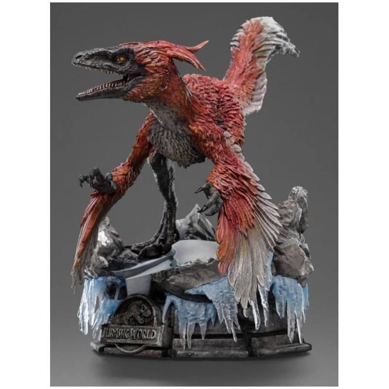 La estatua presenta un dinosaurio con plumaje detallado en tonos rojizos y grises, posado sobre un paisaje rocoso y helado que añade drama y realismo a la escena. Las texturas y acabados cuidadosos hacen de cada pluma y garra una obra de arte en miniatura, ideal para exhibir en cualquier espacio.