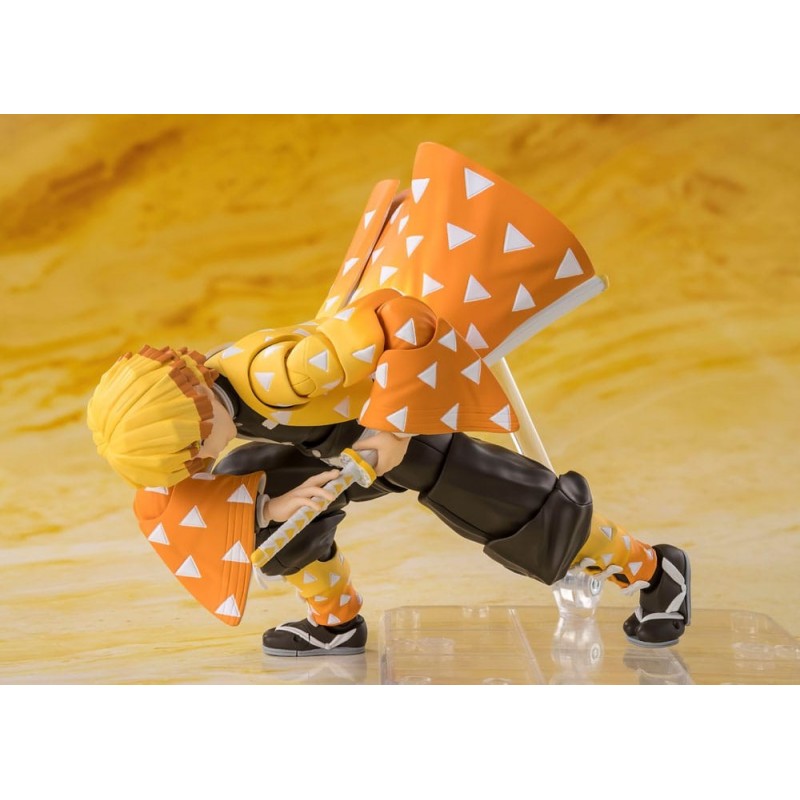 Zenitsu se presenta con su característico uniforme negro y su distintivo haori amarillo con triángulos blancos, replicados meticulosamente para capturar su esencia única. La figura incluye múltiples puntos de articulación, permitiendo recrear una variedad de poses dinámicas y escenas icónicas del anime.