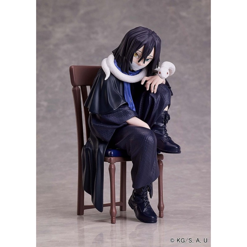 La figura representa a Obanai sentado en una silla, con su característico atuendo oscuro y su inseparable serpiente blanca alrededor del cuello, capturando su esencia misteriosa y enigmática. La atención al detalle en su vestimenta y postura la convierte en una pieza única en cualquier colección de manga y anime.