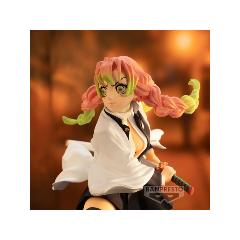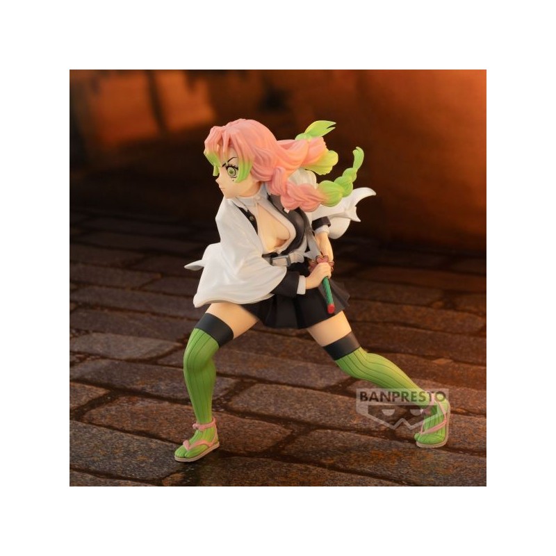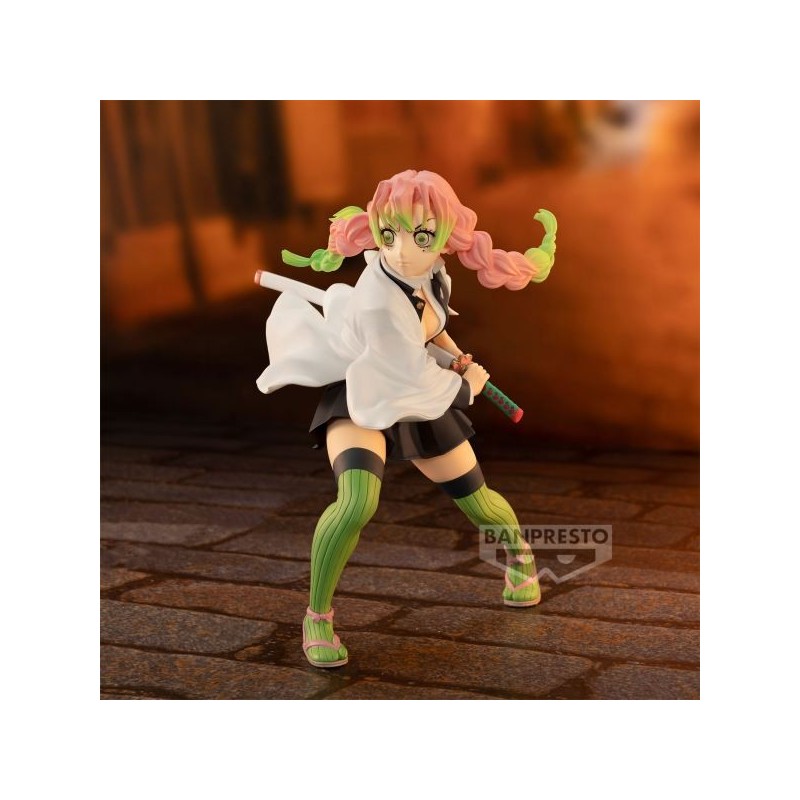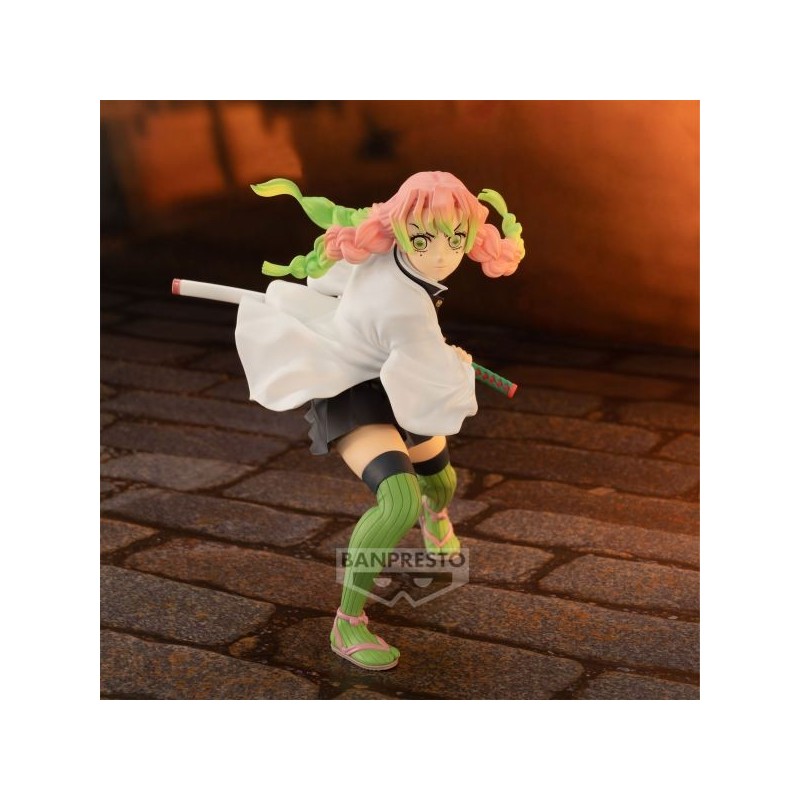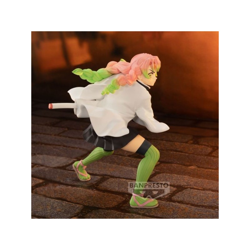 Con un diseño detallado y colores vivos, Mitsuri Kanroji se presenta en una pose dinámica y característica de su personalidad en el anime. El pelo rosa y verde, combinado con su atuendo tradicional, resalta cada detalle de esta pieza coleccionable que hará brillar tu colección.