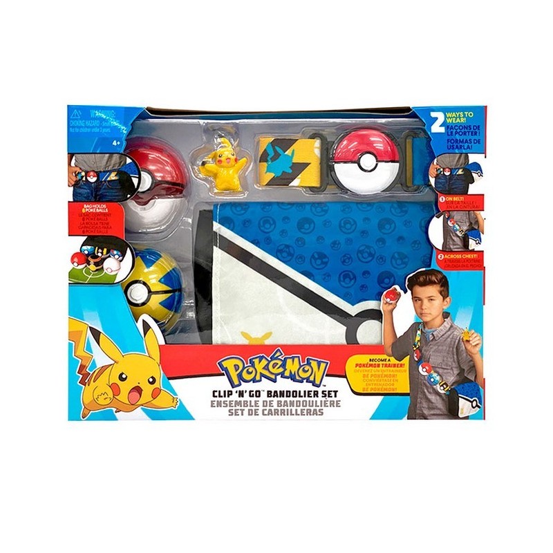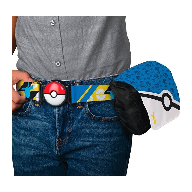 La bandolera presenta un diseño en tonos azul y negro con detalles de pokeballs en la correa ajustable. Incluye figuras de Pikachu y Charmander, junto a diferentes modelos de pokeballs, aportando realismo a tus batallas.