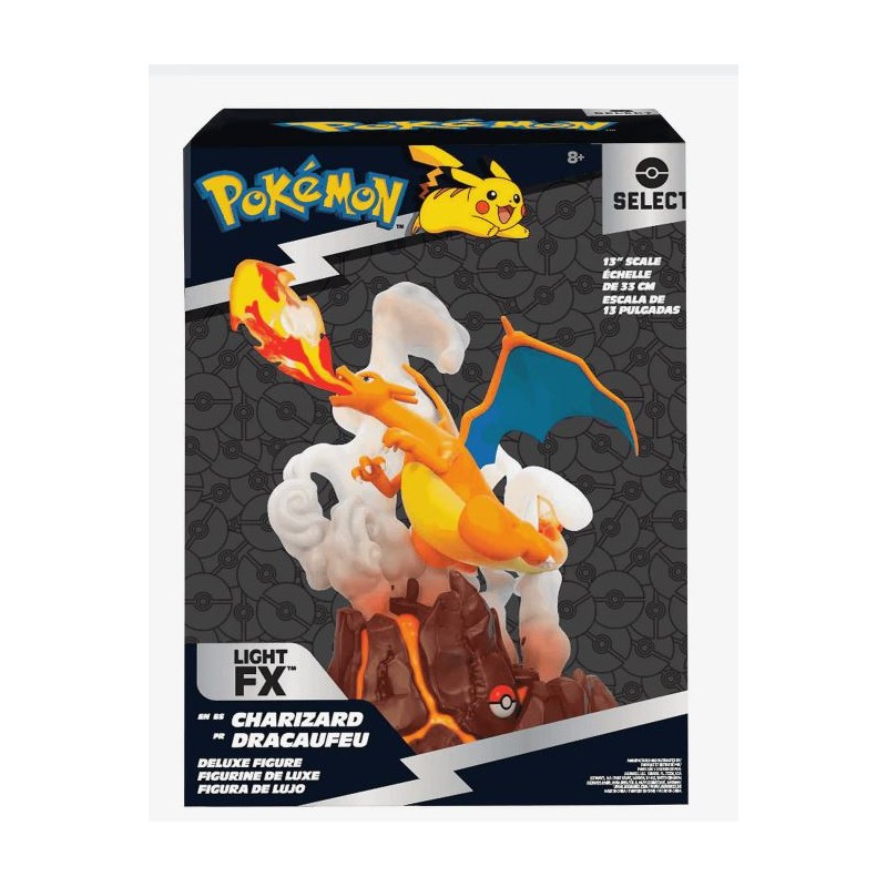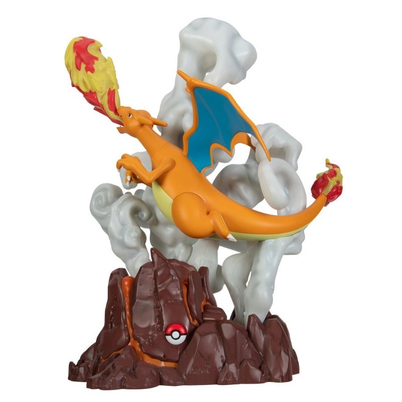 El diseño incluye un entorno volcánico con lava y humo, en tonos marrones y grises, destacando a Charizard en vibrantes colores naranjas y amarillos. Sus alas azul celeste y la llama roja en su cola son inconfundibles. Aunque las baterías no están incluidas, la figura es fácil de incorporar a cualquier colección.