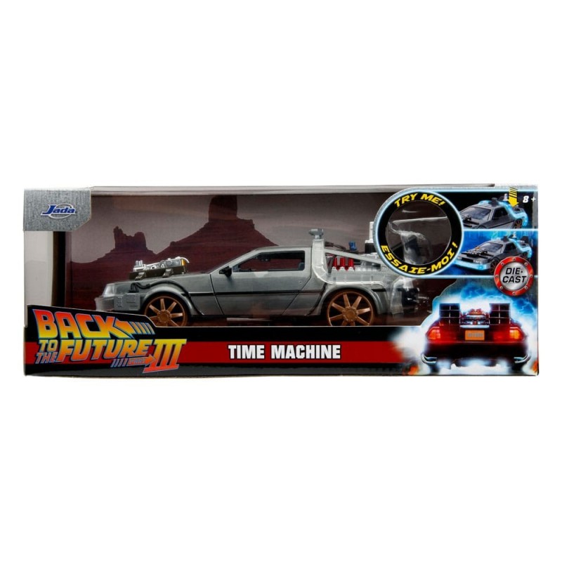 Esta magnífica réplica del DeLorean Time Machine de Zurück in die Zukunft III es un fiel homenaje al icónico vehículo que todos los fans de la saga reconocerán al instante. El modelo a escala 1/24 está fabricado en metal diecast, garantizando una gran calidad y detalles excepcionales que harán las delicias de cualquier coleccionista.