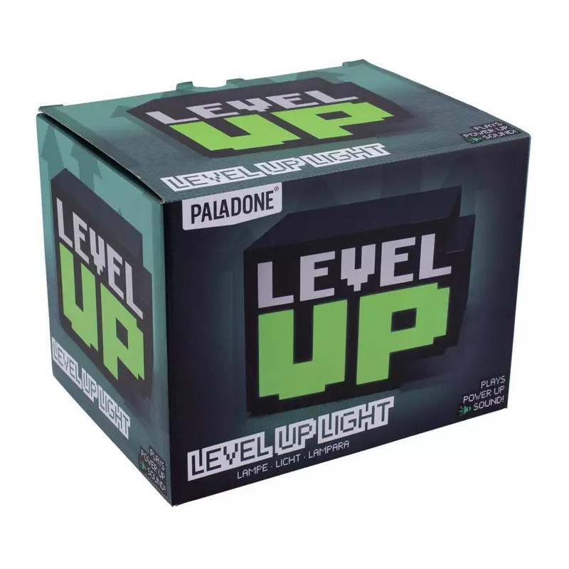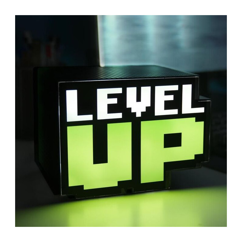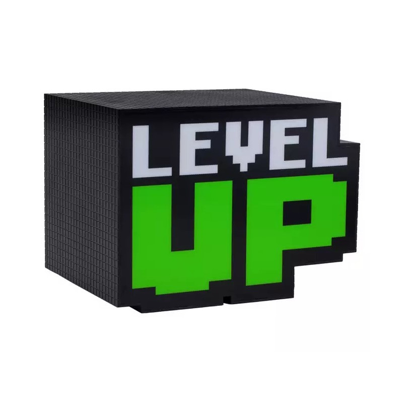 Una pequeña lámpara que proporciona una agradable luz de ambiente a cualquier habitación y que destaca por su genial diseño, con un icónico Level Up reproducido en 3D, con la forma pixelada tan típica de los juegos de 8 bits. Con sus 12 cm de alto tiene el tamaño perfecto para cualquier mesilla, escritorio o incluso estantería. La lámpara funciona con un cable USB que viene incluido y casi no gasta, ya que utiliza LEDs.