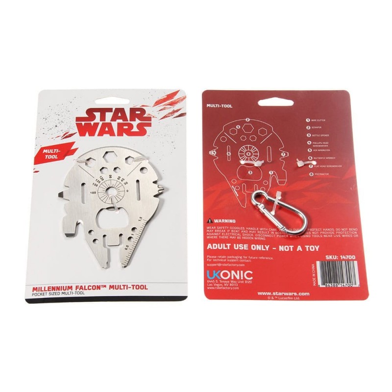 Descubre el Star Wars Multi-Tool Millennium Falcon, un práctico gadget con diseño inspirado en la famosa nave espacial de Star Wars. Este multi-herramienta de bolsillo, fabricado por Ukonic, es perfecto para los fans de la saga. Con licencia oficial, combina funcionalidad y diseño al ofrecer múltiples herramientas en una estructura compacta.