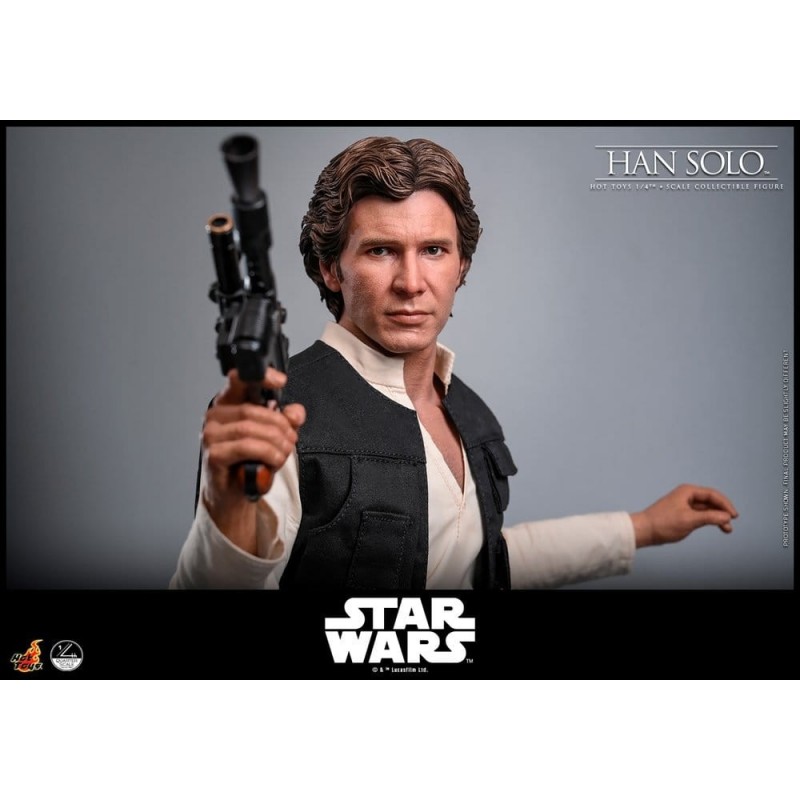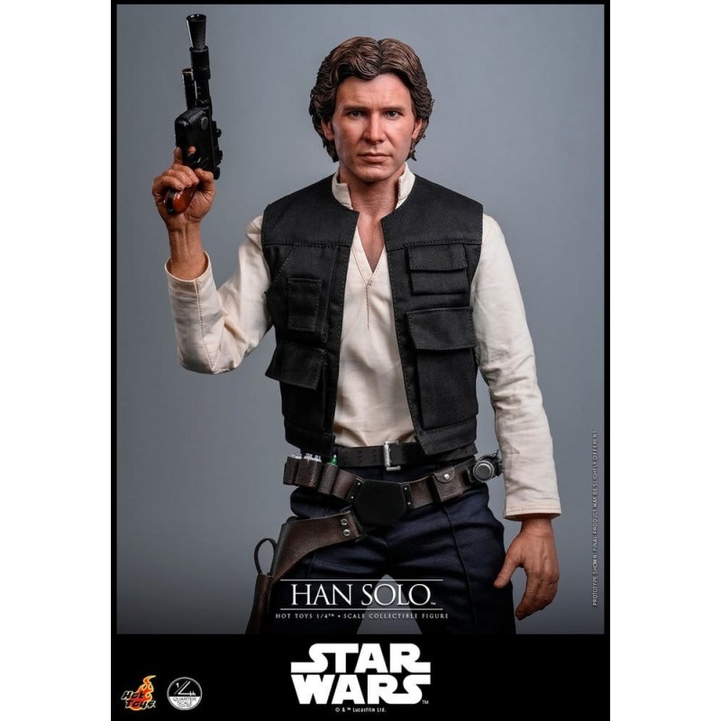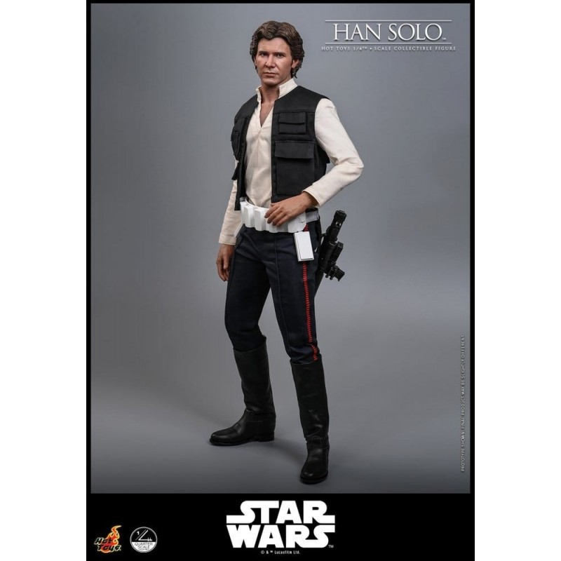 Sumérgete en el universo de Star Wars con esta impresionante figura articulada de Han Solo, una obra maestra de Hot Toys a escala 1/4. Con un tamaño aproximado de 46 cm, esta figura captura cada detalle icónico del personaje, desde su chaleco negro y camisa blanca hasta sus pantalones azul oscuro con líneas rojas. La ropa de tela realza su autenticidad, mientras que los accesorios intercambiables, como cinturones y manos, permiten personalizar cada pose.