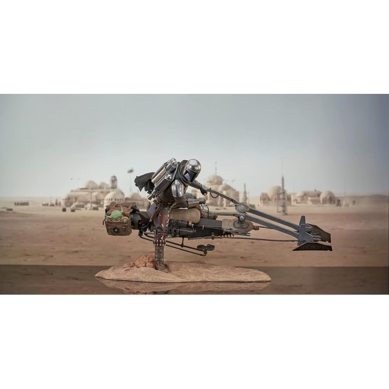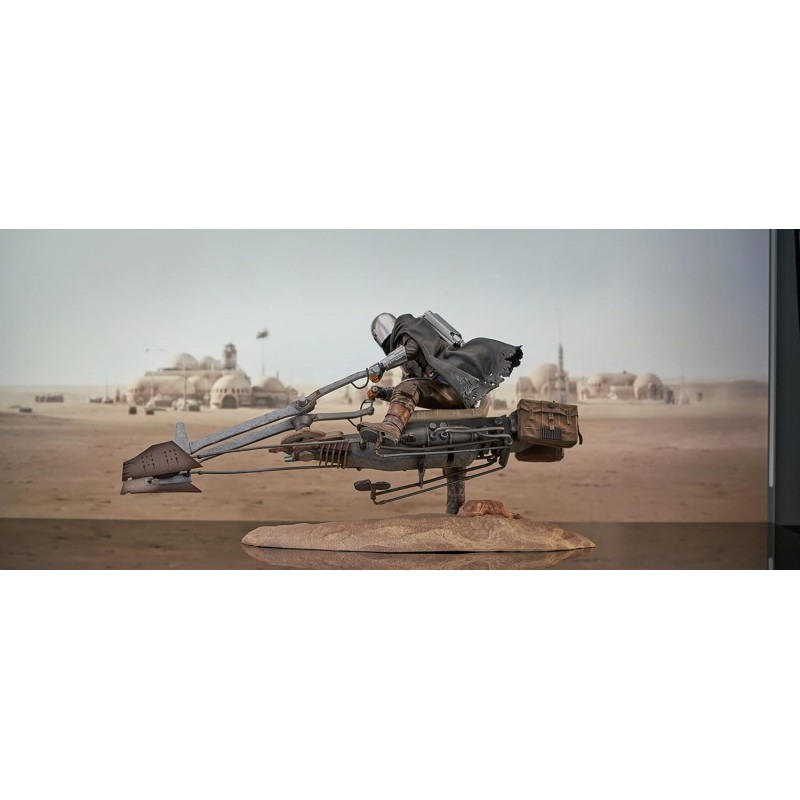 La impresionante estatua de Din Djarin de Star Wars: The Mandalorian es una obra maestra creada por Diamond Select Toys. Con una altura de 23 cm y esculpida a una escala de 1/7, esta figura detalla al Mandaloriano en una pose dinámica sobre su moto speeder.