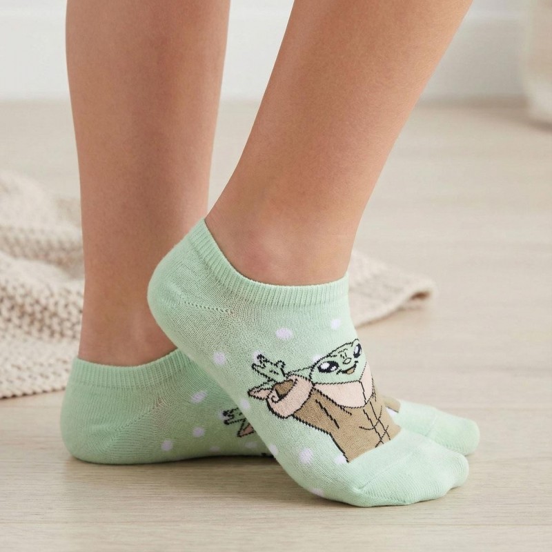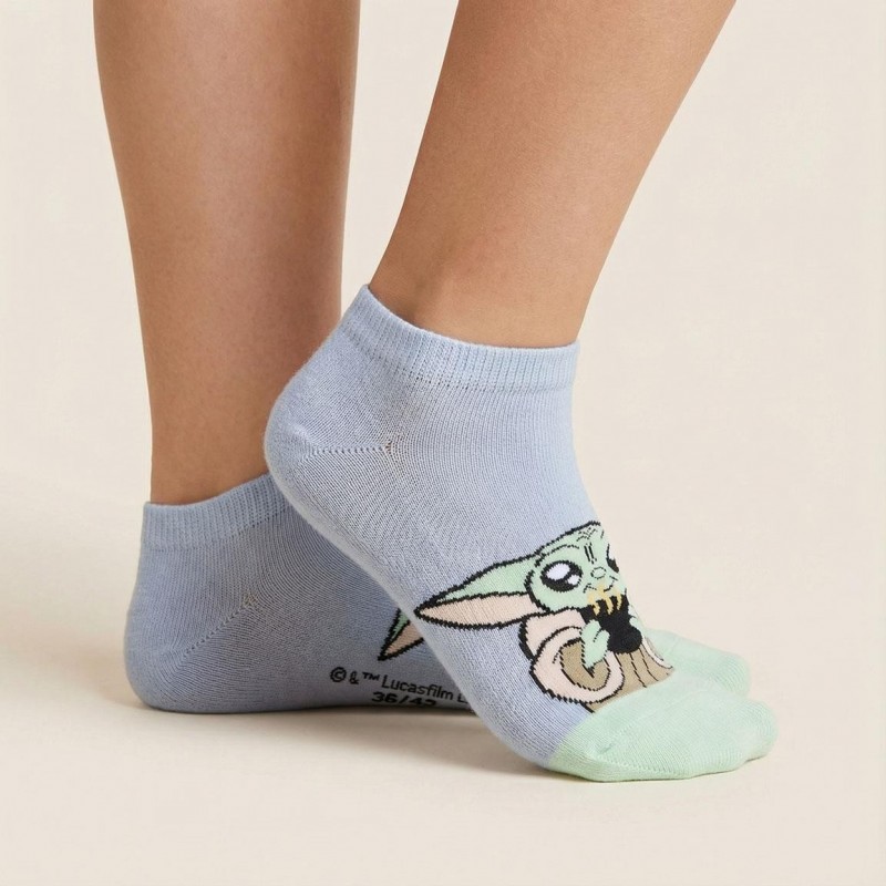 Los calcetines cuentan con un diseño sin talla específica, adaptándose a diferentes tamaños de pie, lo que los hace ideales para regalar. Su bordado de Baby Yoda alzando las manos y comiendo es detallado y aporta un toque divertido a cualquier atuendo. Perfectos para llevar con zapatillas o zapatos bajos, estos pinkies son el complemento ideal para quienes desean expresar su amor por la saga de una forma sutil y estilizada.