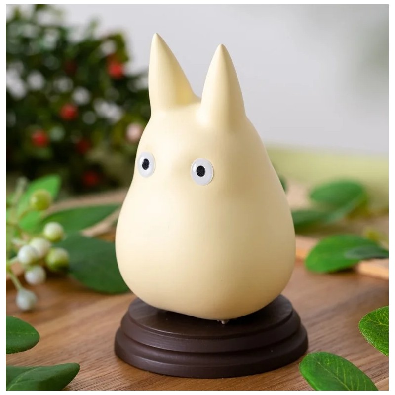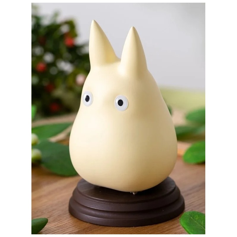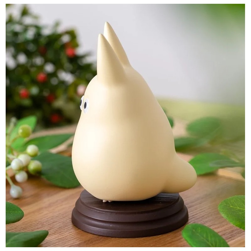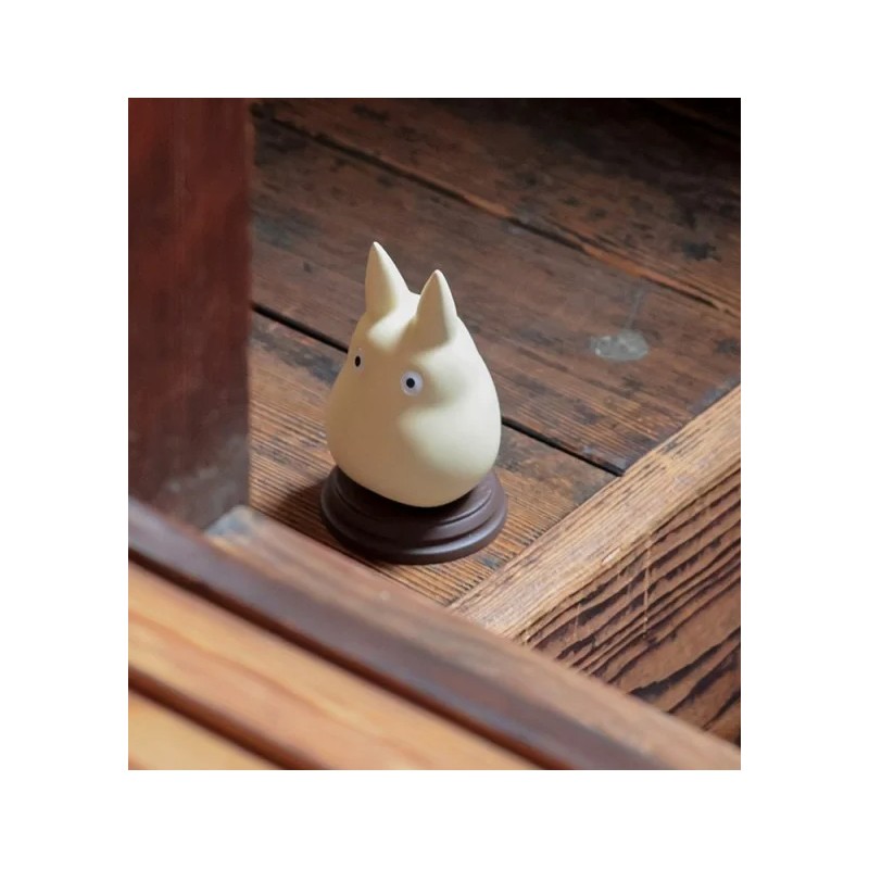 El diseño simple pero icónico muestra a Totoro en un tono blanco suave, con sus características orejas puntiagudas y ojos grandes que reflejan una apariencia de sorpresa. La base marrón proporciona estabilidad y un toque de elegancia.