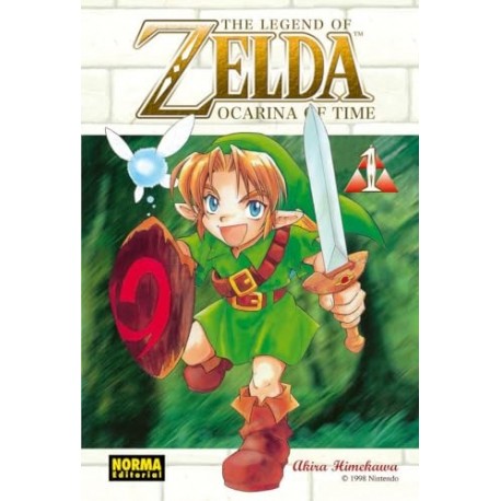 La portada del manga The Legend of Zelda: Ocarina of Time 01 nos presenta a un joven Link en una representación vibrante y colorida, con su clásico atuendo verde, una espada en la mano derecha y un escudo en la izquierda. A su lado, vemos a Navi, el hada, flotando. La portada resalta con colores intensos y un diseño que captura la esencia aventurera del juego original, siendo una pieza esencial para los aficionados a la saga.