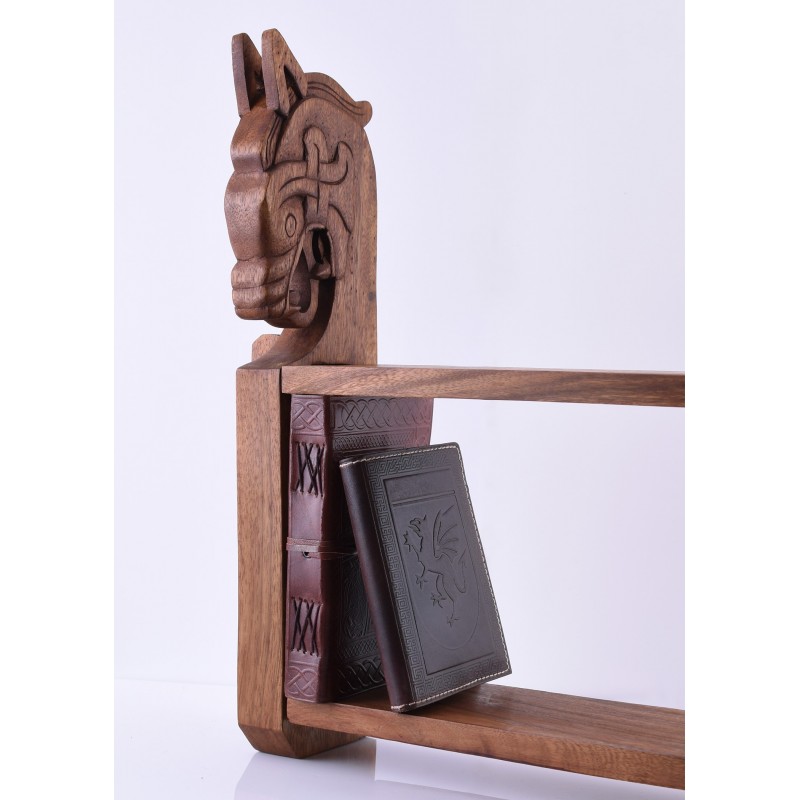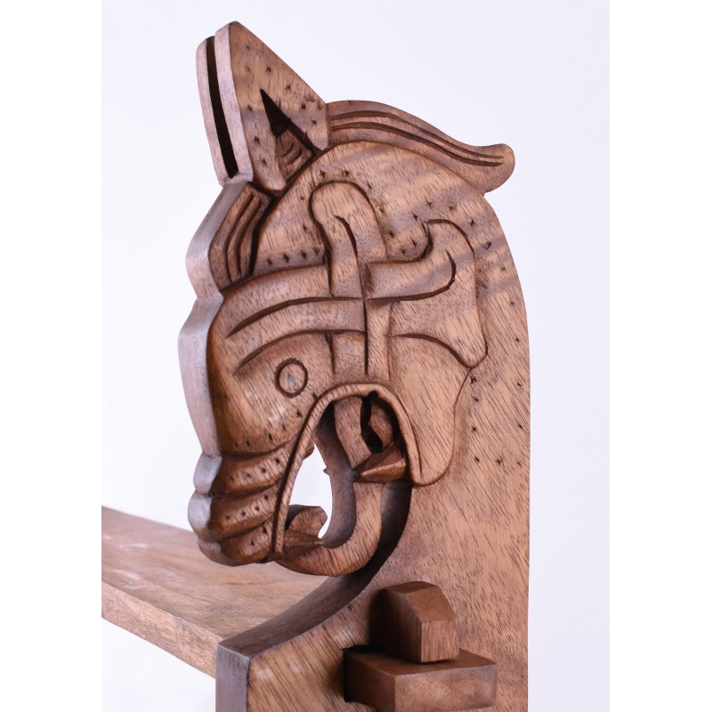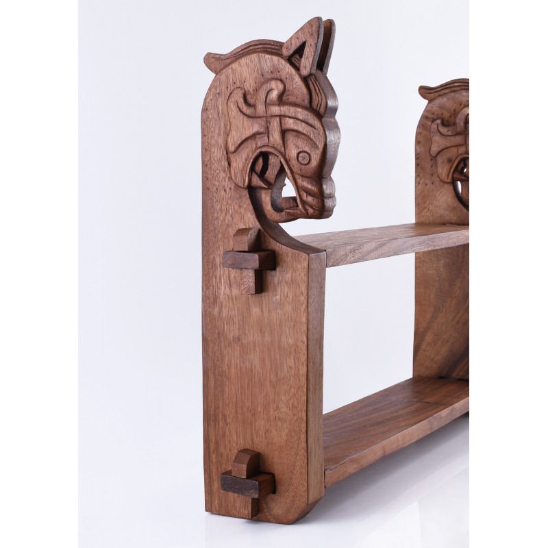 Esta hermosa estantería de pared está hecha de madera de suar y añadirá un toque de estilo vikingo a tu decoración. El diseño de las dos cabezas de dragón se basa en un hallazgo del barco Gokstad en Noruega.