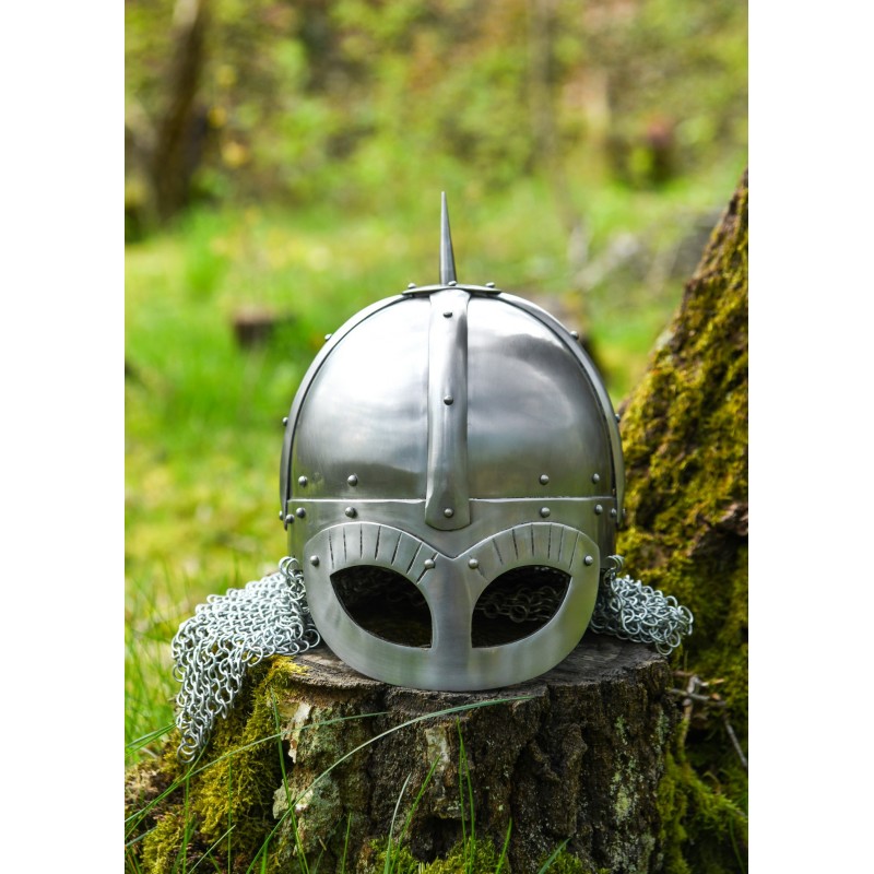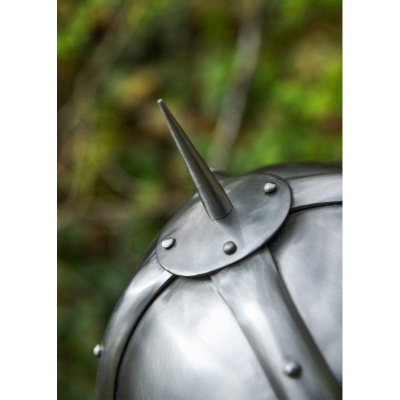 Ideal para recreaciones históricas o como pieza de colección, este casco es una muestra de la artesanía tradicional vikinga, ofrecida por la reconocida marca Battle-Merchant.