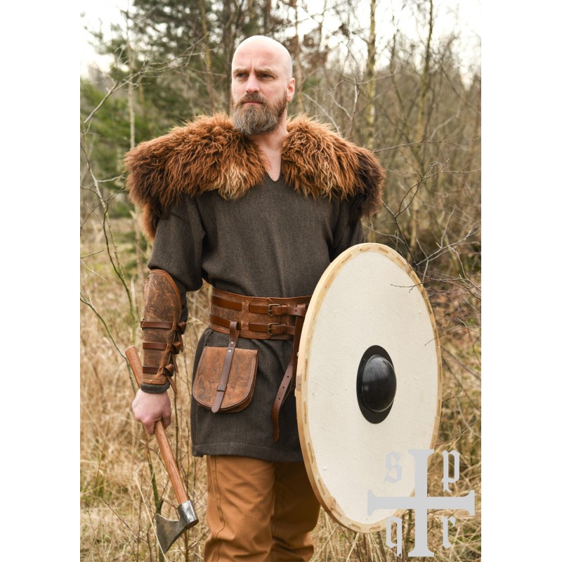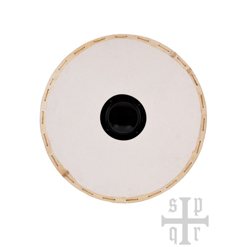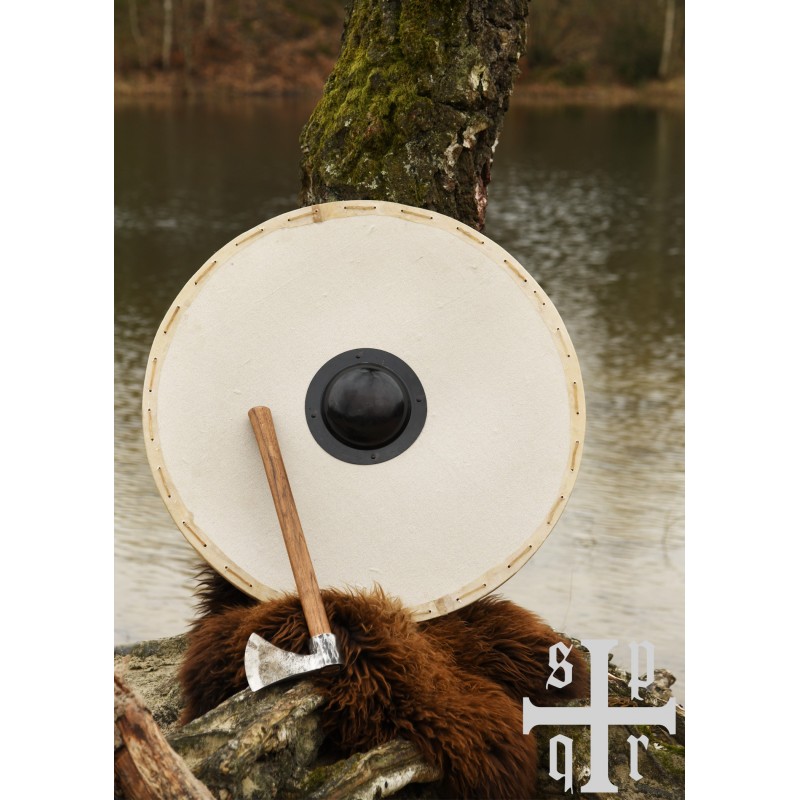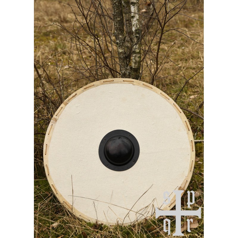 Este escudo redondo vikingo es una pieza esencial para cualquier entusiasta de la recreación histórica o combates simulados. Hecho de 3 capas de madera MDF, el frente está cubierto con un lienzo natural de color crudo, ideal para personalizar con tus propios diseños. El borde, revestido de cuero crudo, proporciona una resistencia superior a los impactos, prolongando la vida útil del escudo.